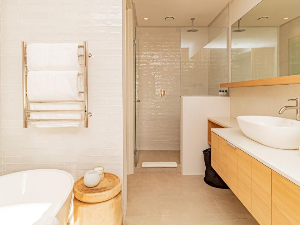 Open plan en-suite bathroom with free-standing bath, double vanity and shower.