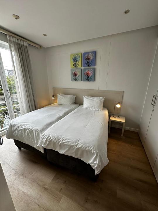 Spacious apartment, with terrace and beautiful views over the canal. Main bedroom, Queen bed with en-suite Shower and bath. Second bedroom, 2 x single beds and en-suite shower only.