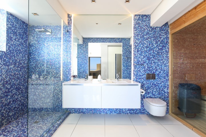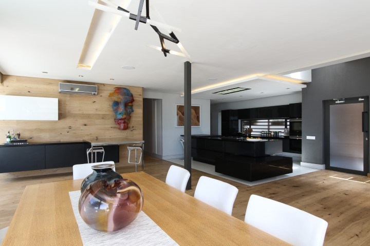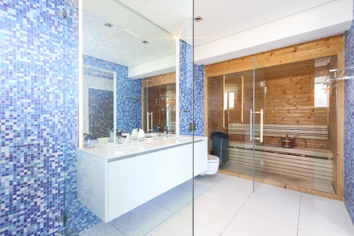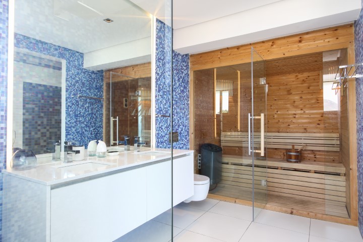 This contemporary property is configured over two levels and boasts 400m2 floor space. It has five double bedrooms, all en-suite, and an impressive open place living space, ideal for both family life and entertaining. This includes a spacious lounge and dining areas and a fully fitted Italian designer kitchen with integrated appliances. The master bedroom features a sauna giving you the ultimate spa feel. The lounge and dining area lead out to the pool, terrace, garden, and BBQ area.