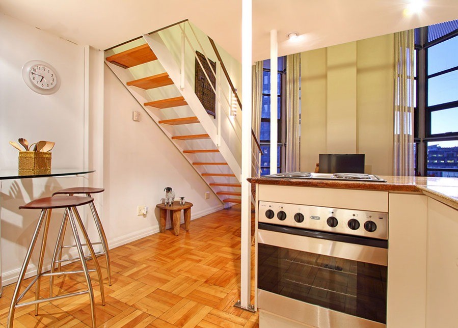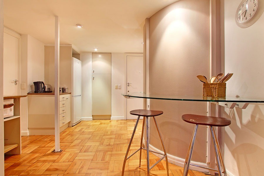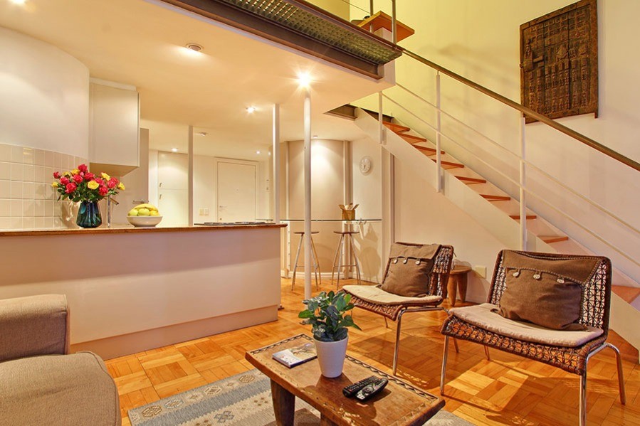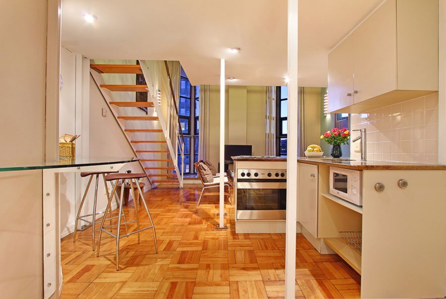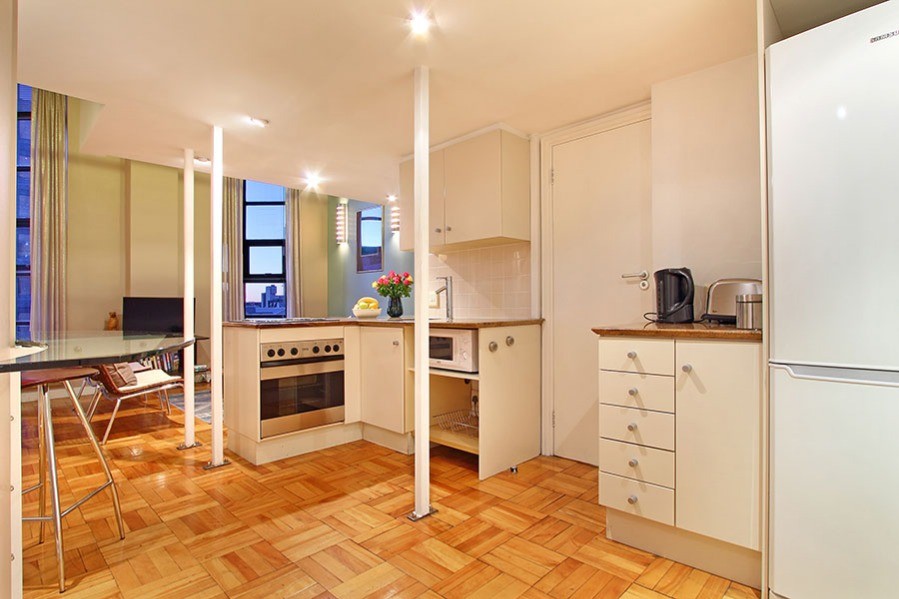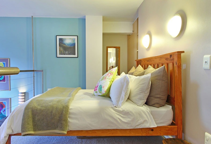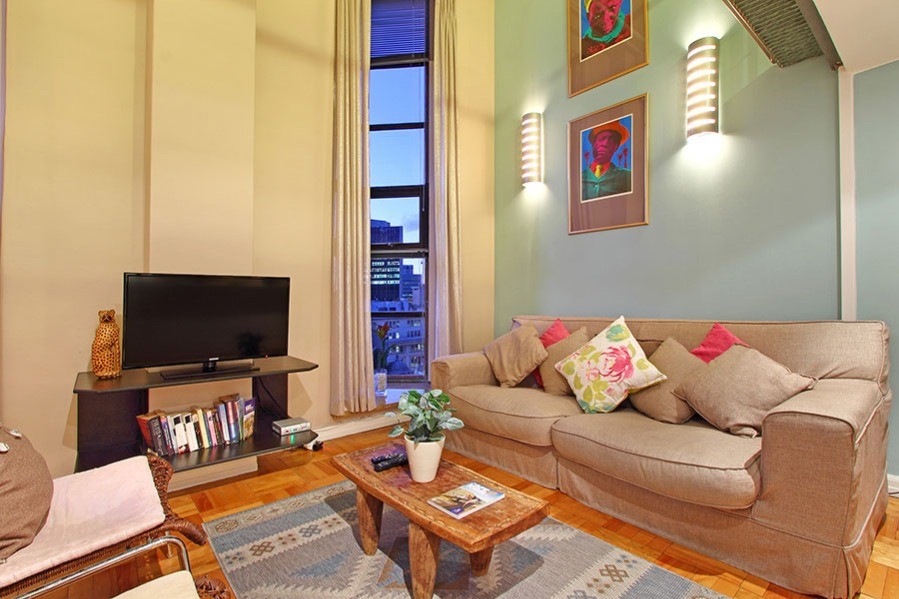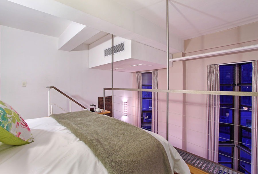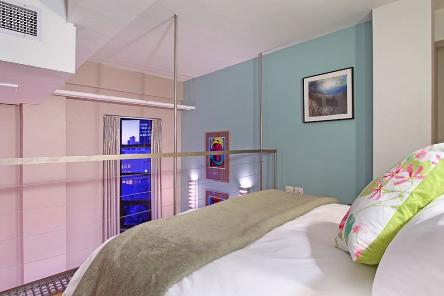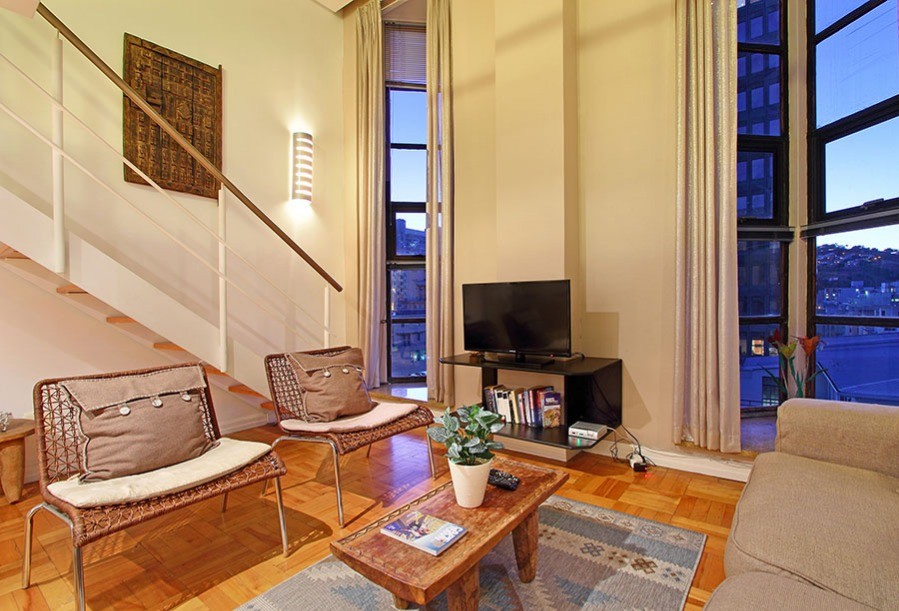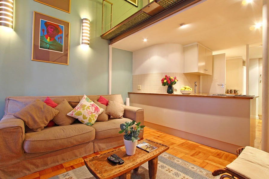 You know you are in the heart of sunny Cape Town in the one-bedroom Antares loft apartment, when you look out of the tall 7th floor windows over a city skyline of old spires rubbing shoulders with new hotels.