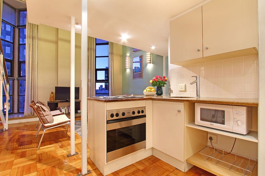 Antares one-bedroom apartment is light filled from its tall windows and double-volume space in this historic Mutual Heights art-deco building.