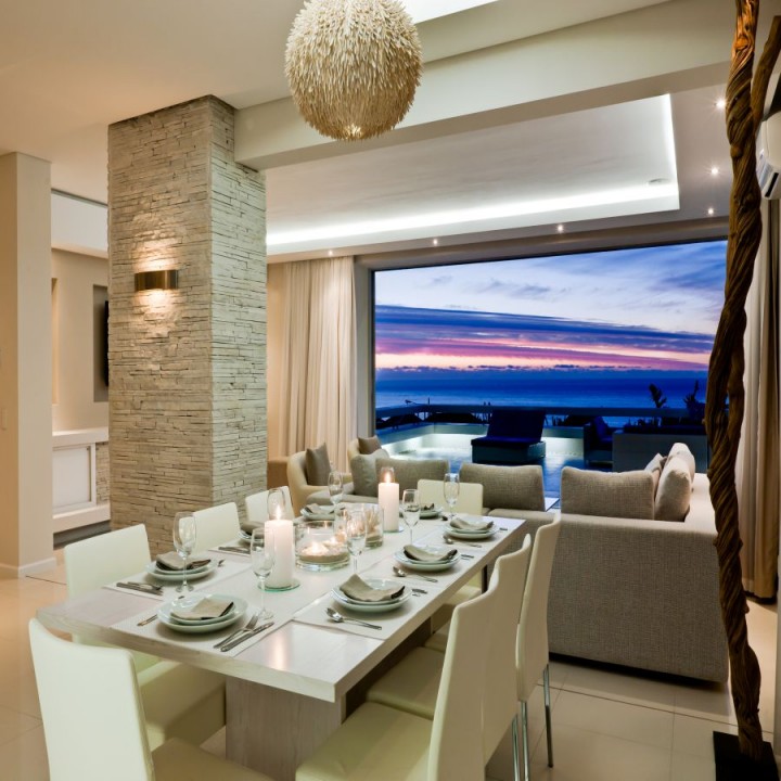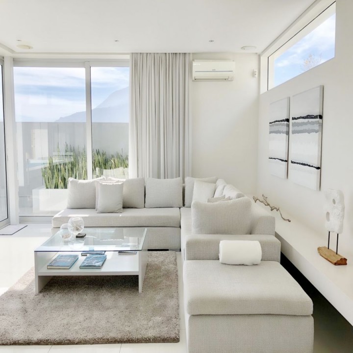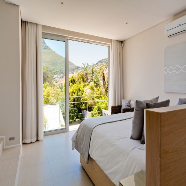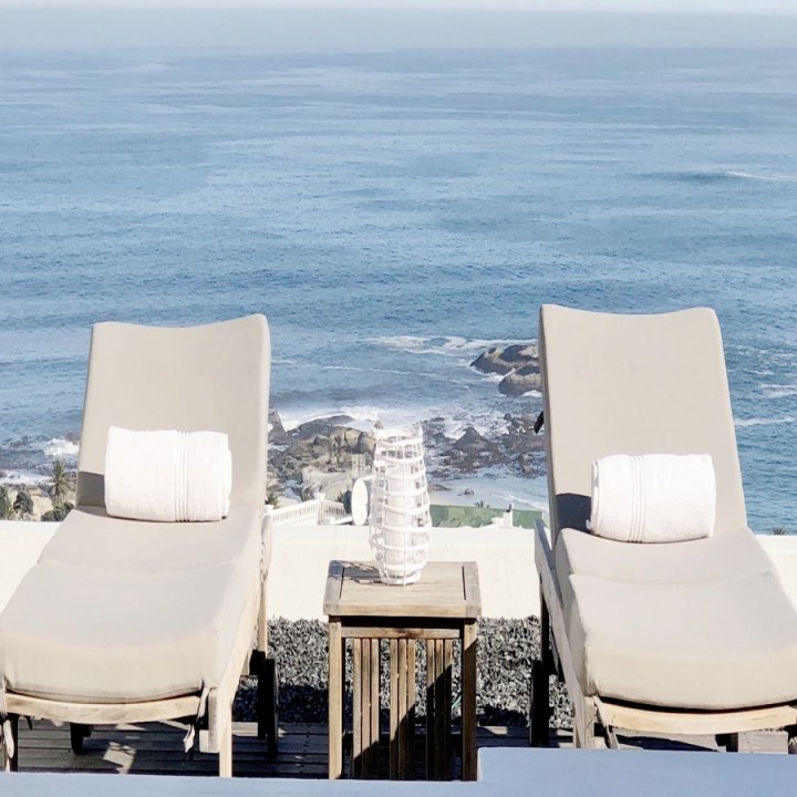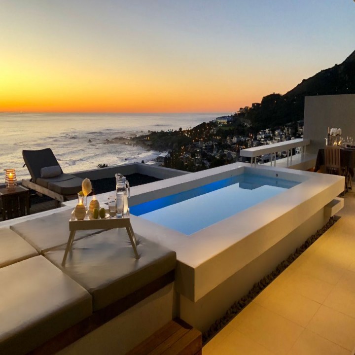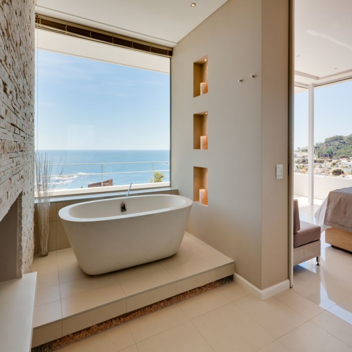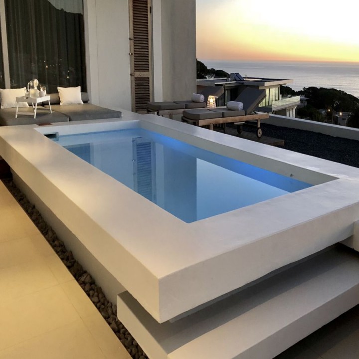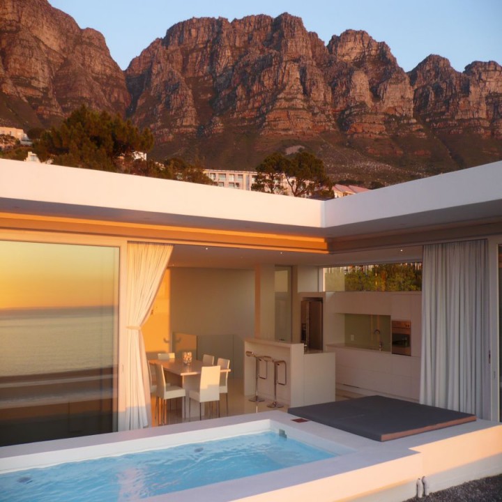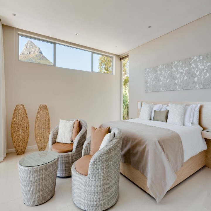 Set on the slopes of Table Mountain, Aquatic Villa provides exceptional views of the sea, beach and mountains from all three levels. The interior is modern with clean lines and calming, sea inspired tones and decor. The extensive outdoor entertainment areas and viewing terraces are comfortably furnished with sofas, daybeds and loungers for gazing at the blue Atlantic or enjoying a sundowner with friends. Aquatic Villa is ideally located in a quiet area of Camps Bay, yet less than 10 minutes walk to the famous beach with its stylish restaurants and bars, and a 10 minute drive to downtown Cape Town and V&A Waterfront. Take an invigorating swim in the large 10X4m pool or workout in the sea facing gym on the property. The villa has five spacious en-suite double bedrooms and can be rented as a whole, or separately as a 3 bedroom house or 2 bedroom penthouse, each with private pool and keyed lift access.