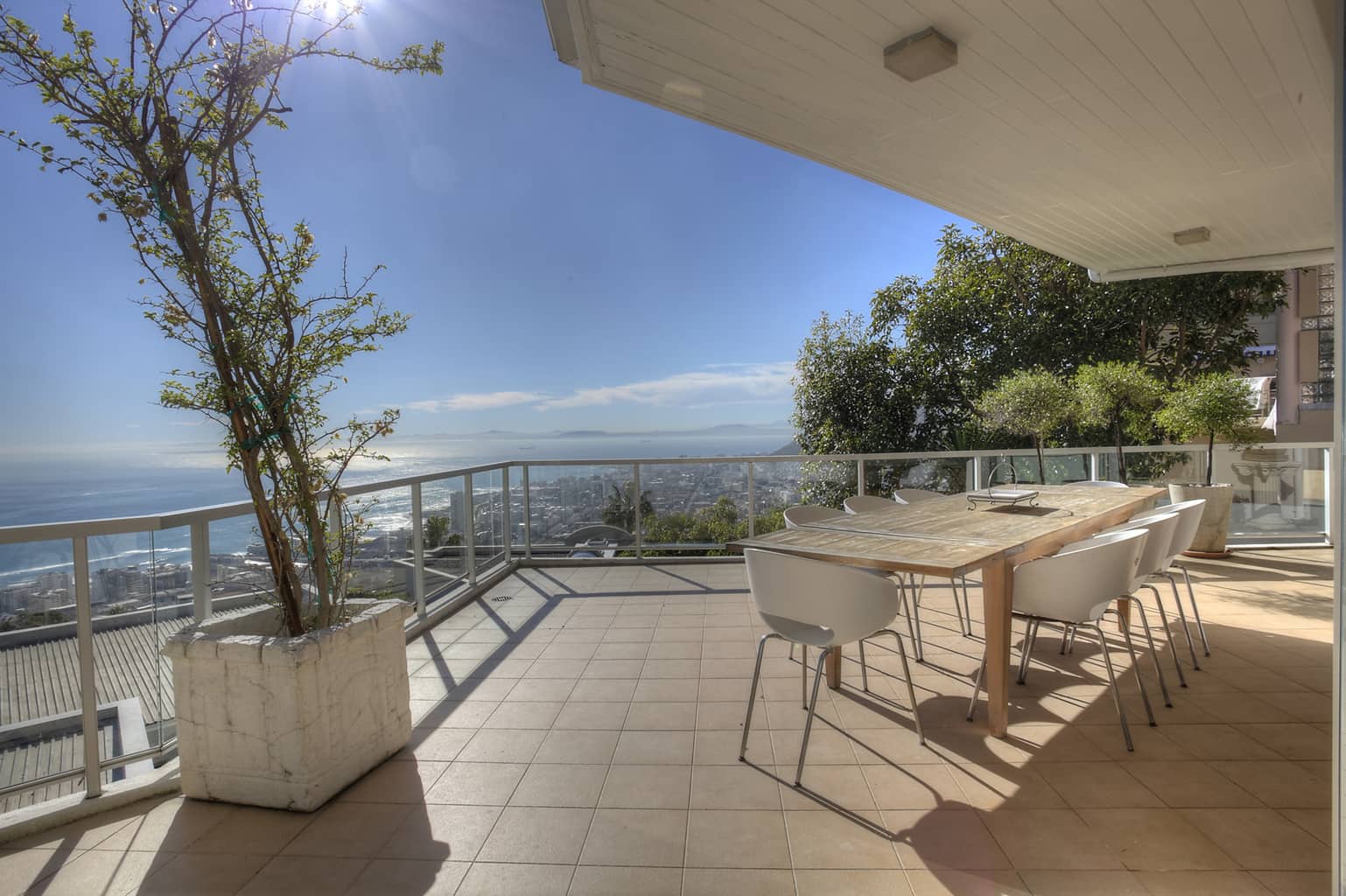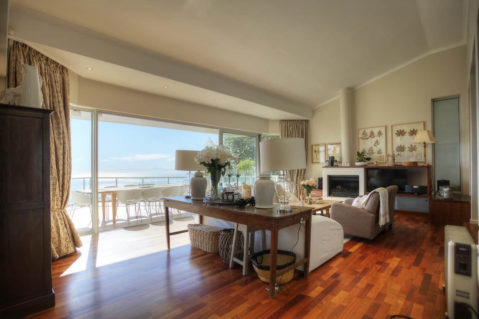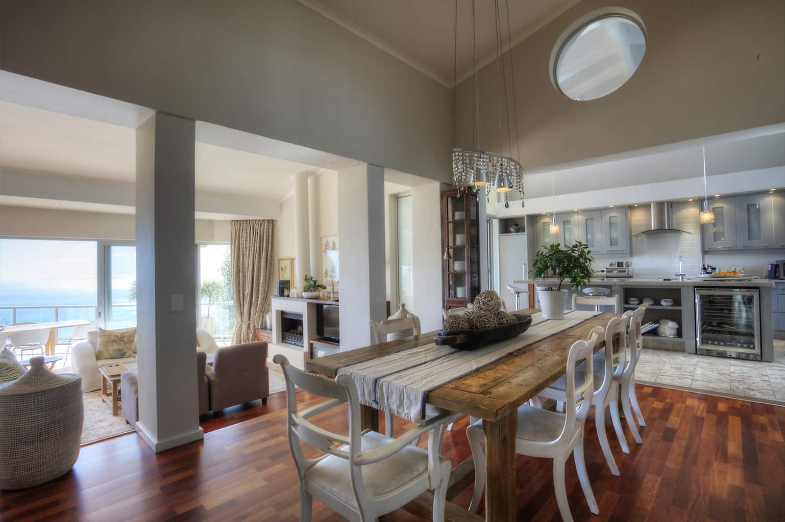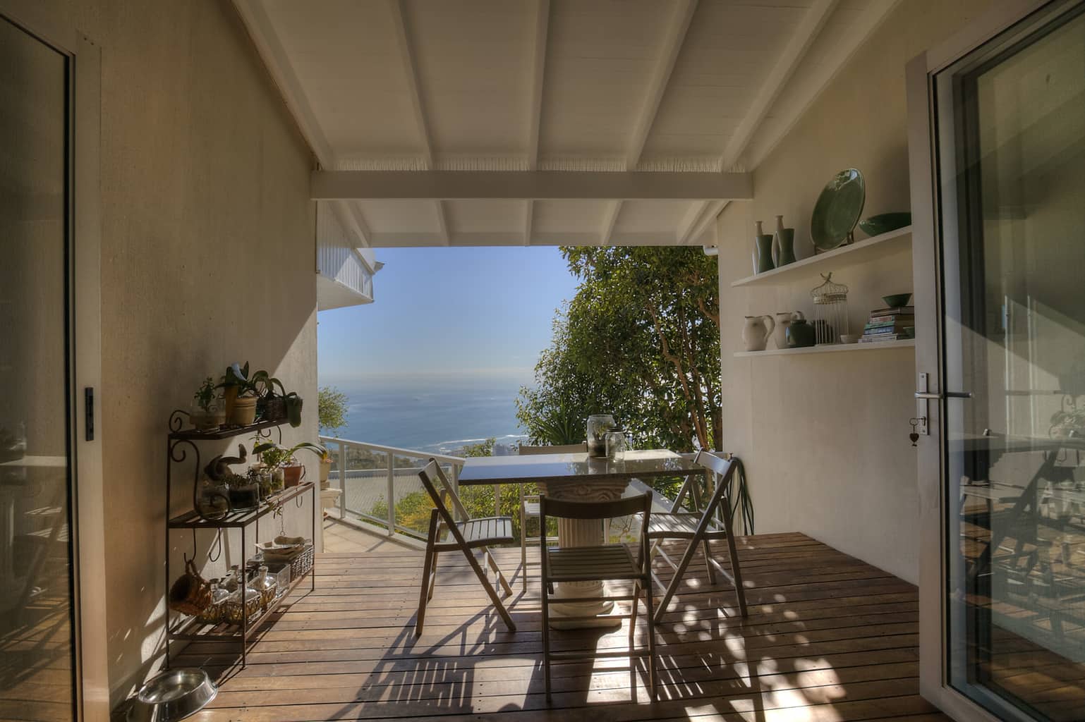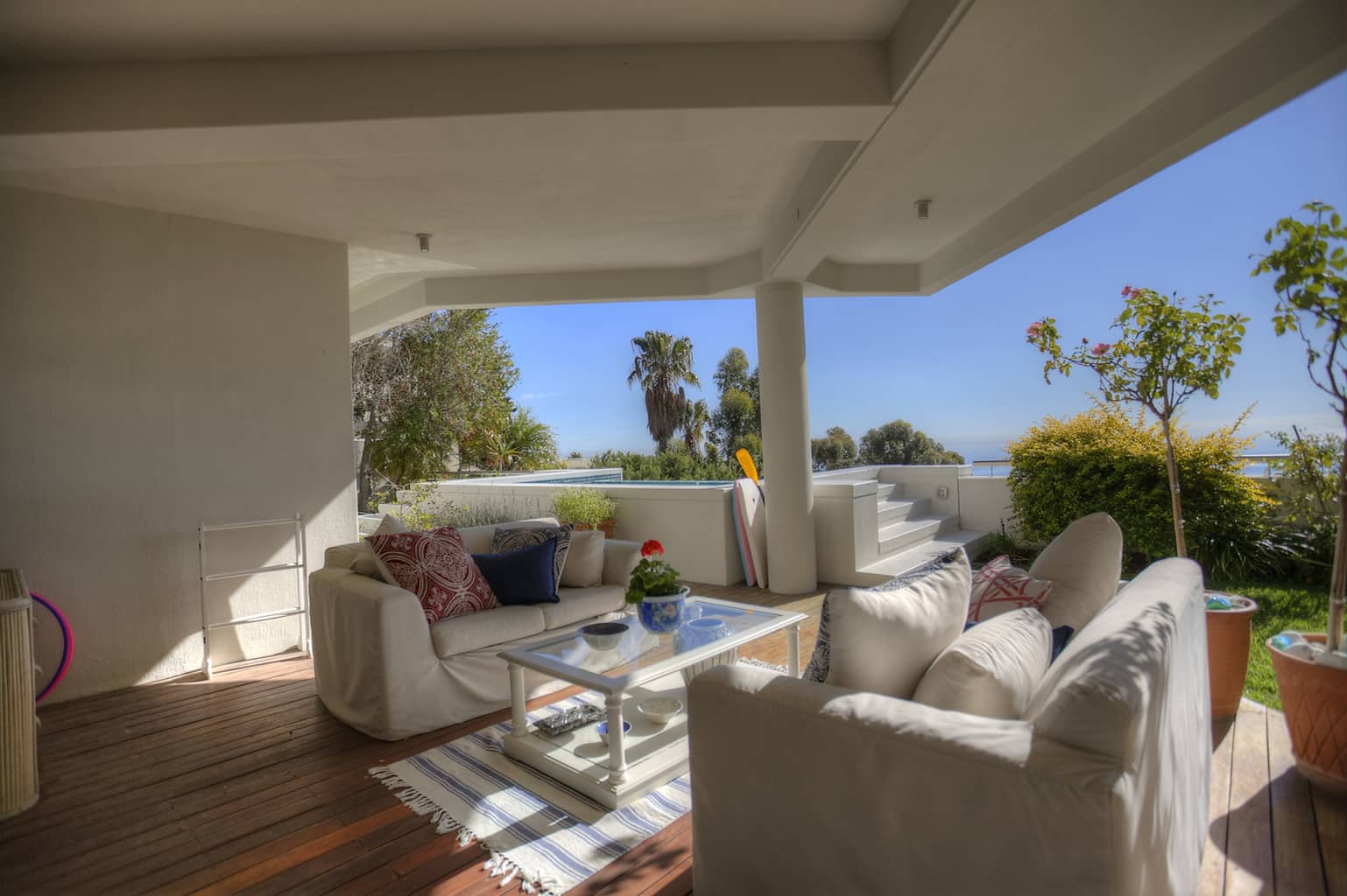 Upstairs the kitchen, dining room with 10 seater table and sitting room open up to the veranda where large groups are easily accommodated for holiday entertaining. The views are truly spectacular. Set in wind-free Bantry Bay, the house is big enough for large scale entertaining, but small enough for a family. The upstairs veranda is perfect for sundowners as well as stylish umbrella covered lunches/dinners whilst a small corner sofa is perfect for that lazy afternoon nap.