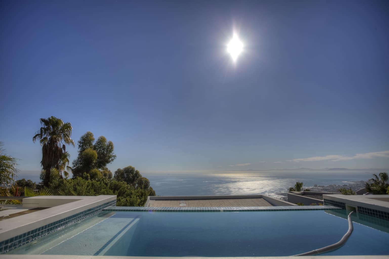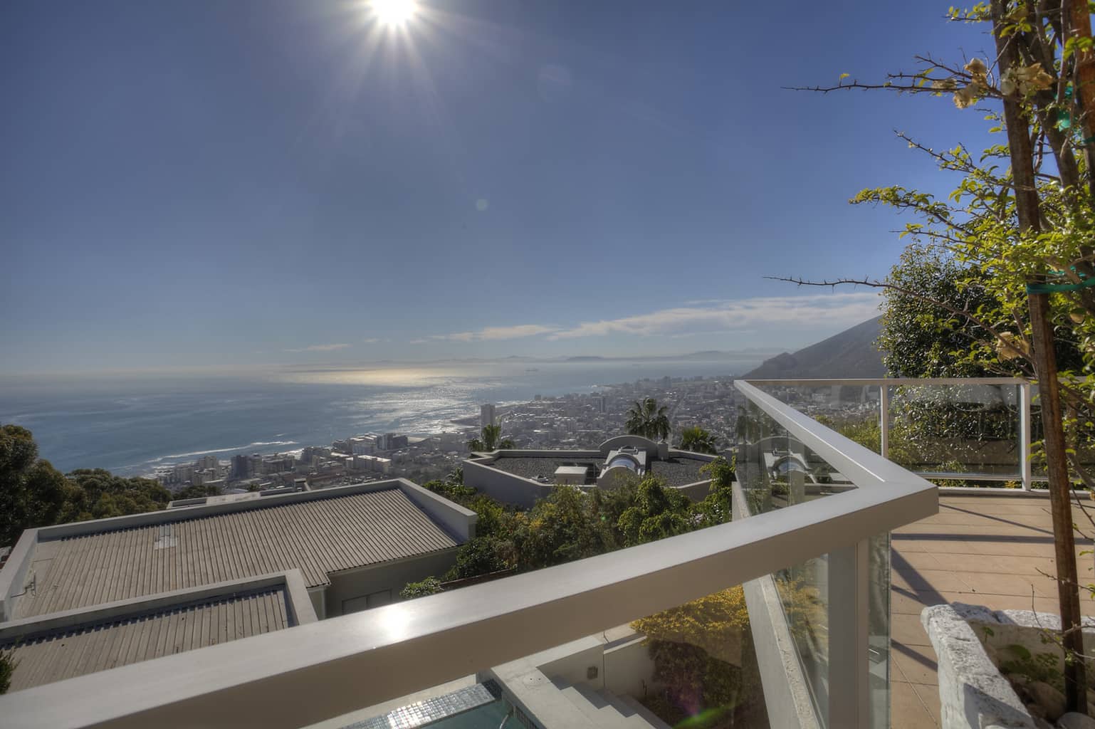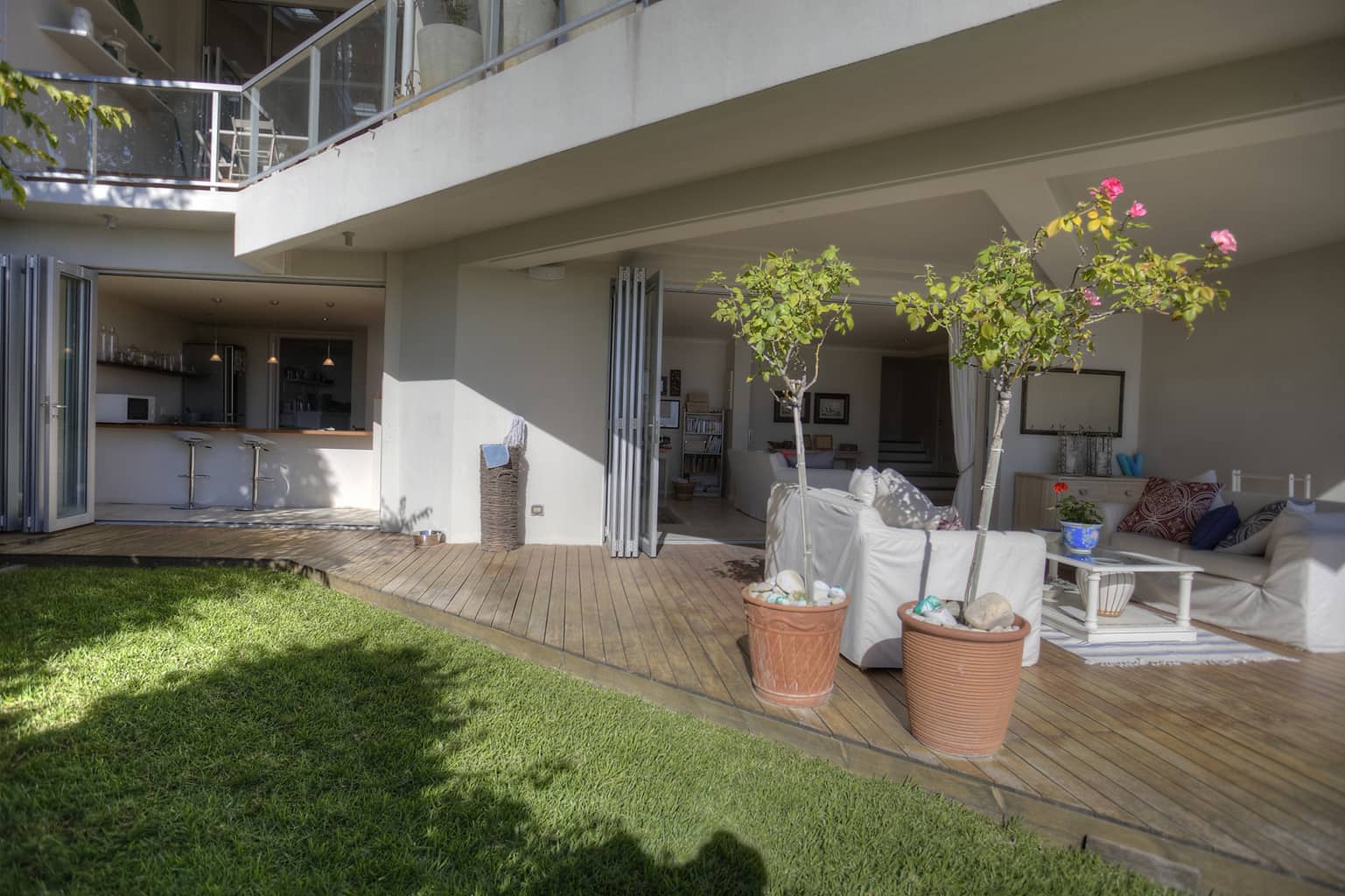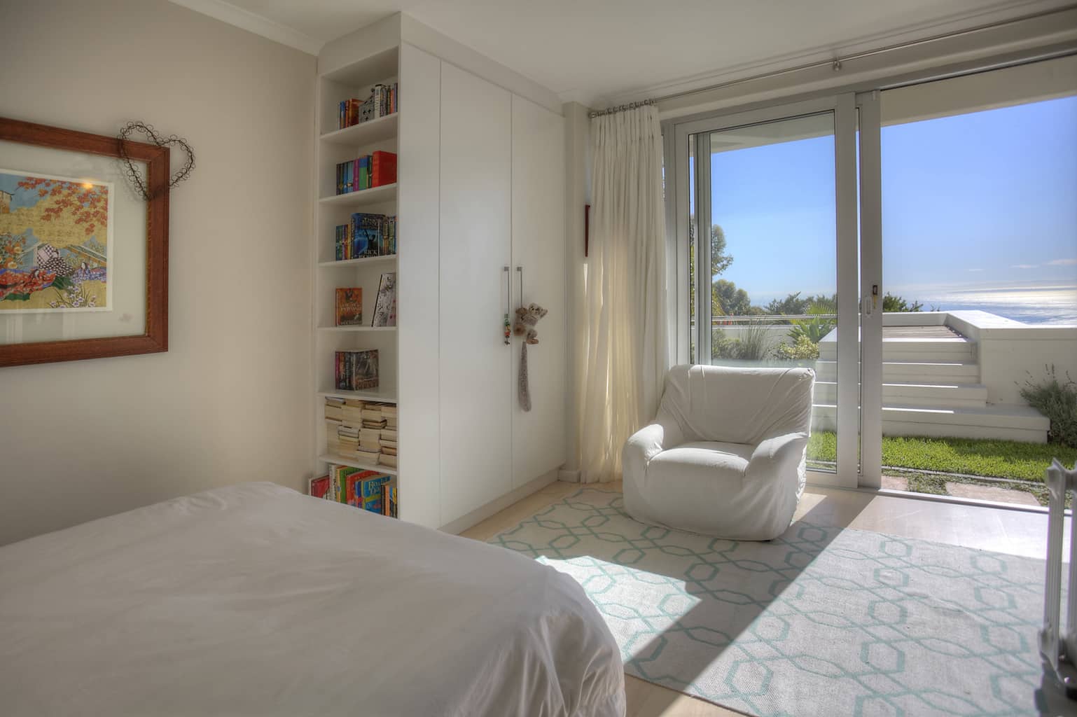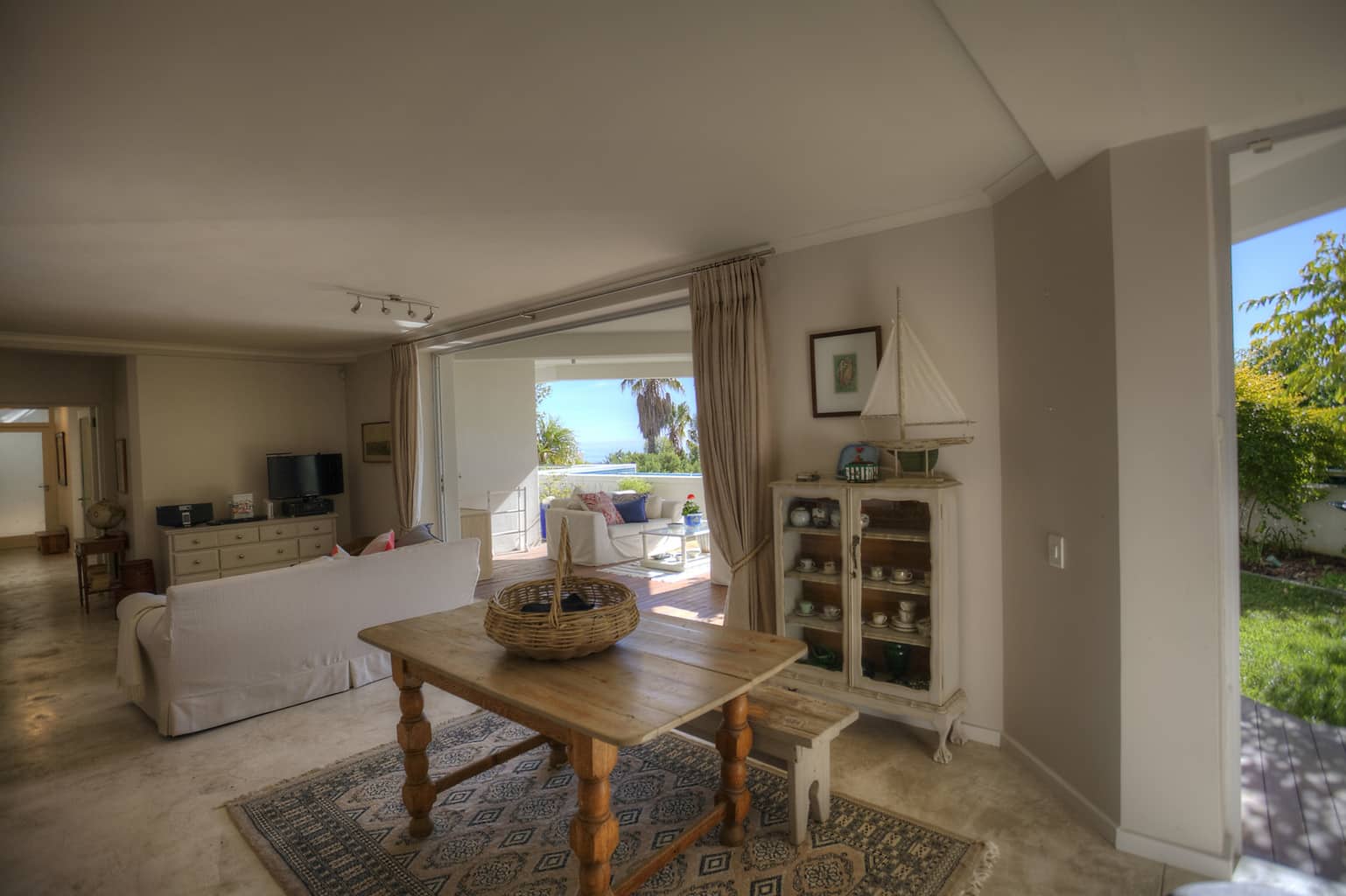 Upstairs the kitchen, dining room with 10 seater table and sitting room open up to the veranda where large groups are easily accommodated for holiday entertaining. The views are truly spectacular. Set in wind-free Bantry Bay, the house is big enough for large scale entertaining, but small enough for a family. The upstairs veranda is perfect for sundowners as well as stylish umbrella covered lunches/dinners whilst a small corner sofa is perfect for that lazy afternoon nap.