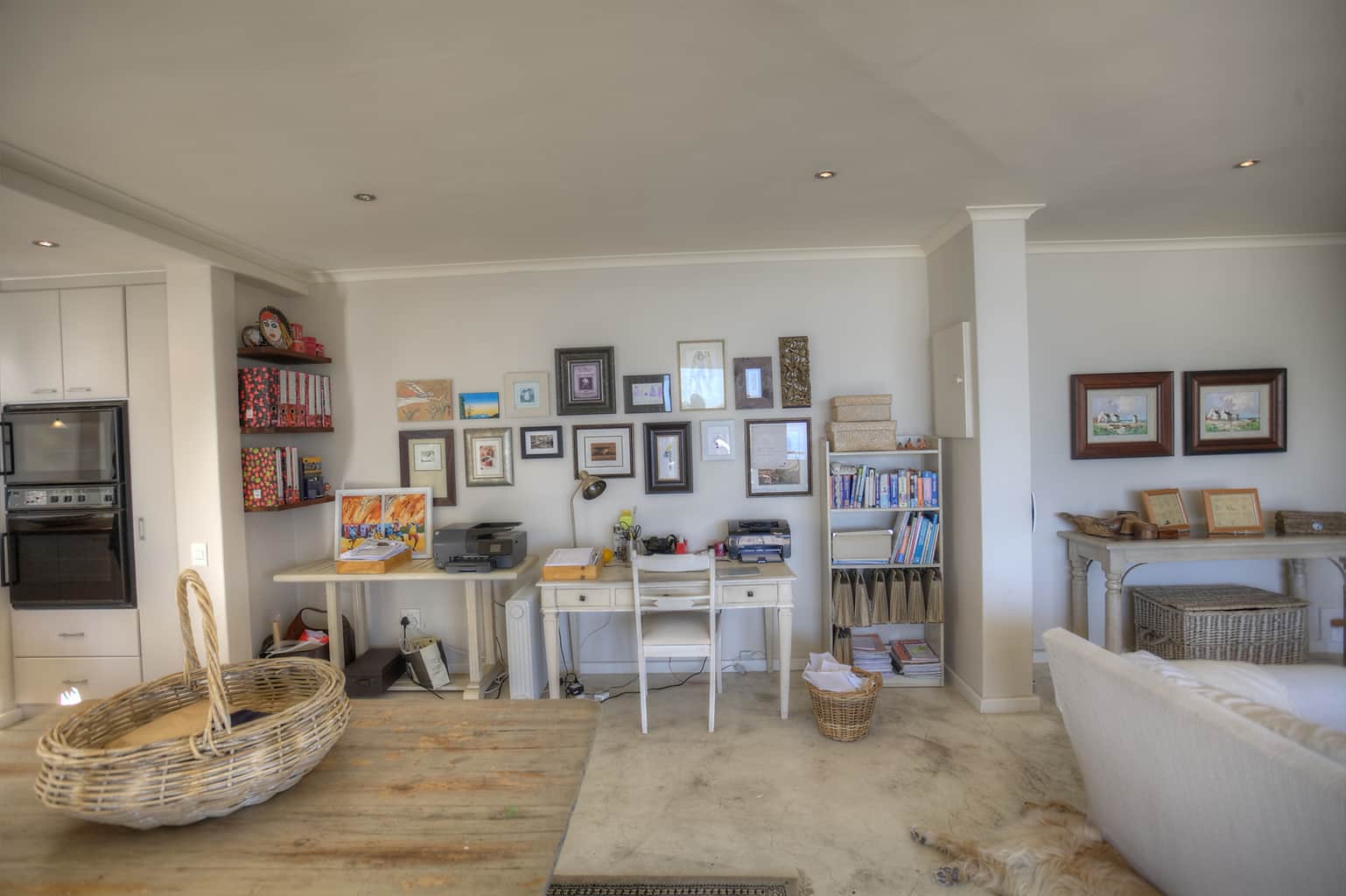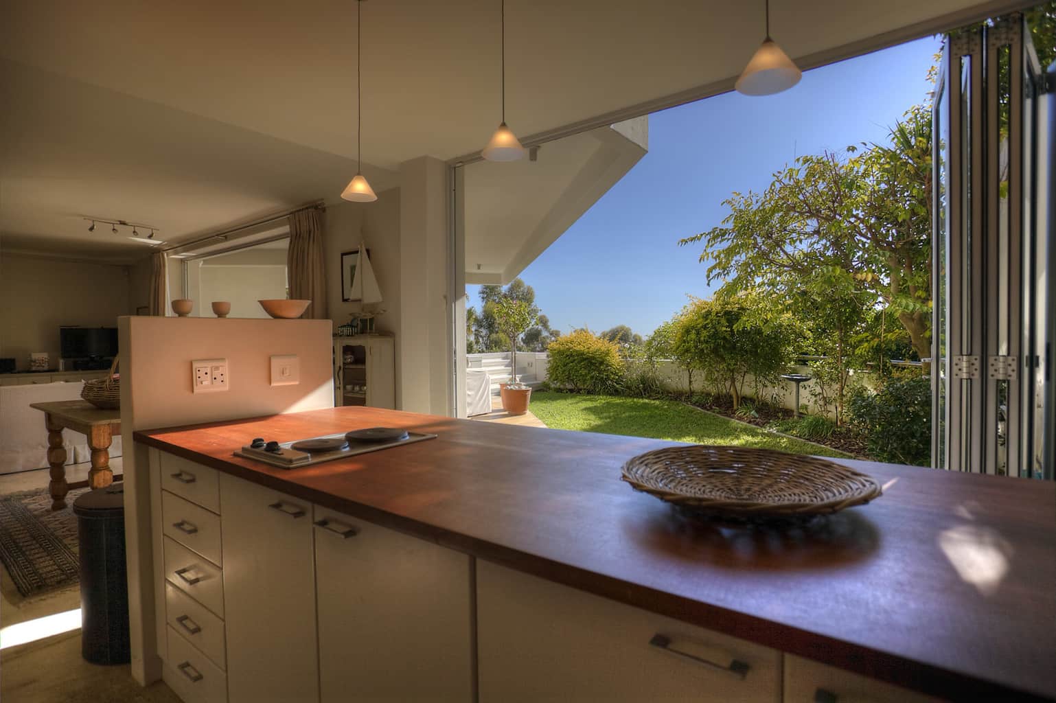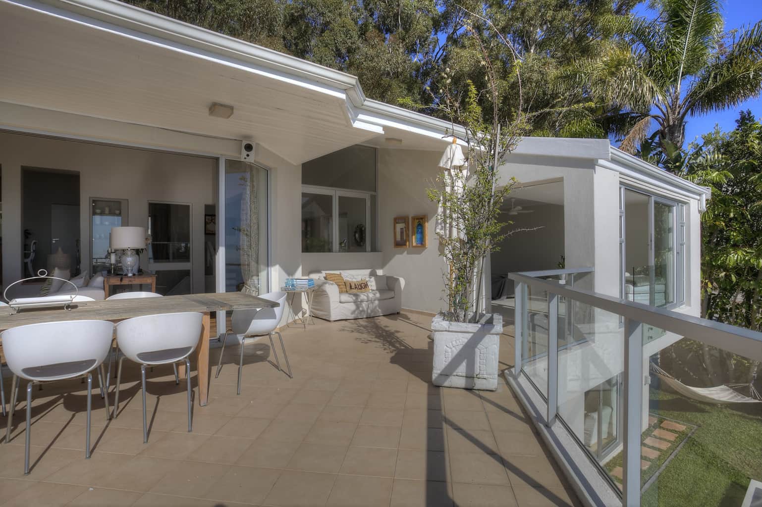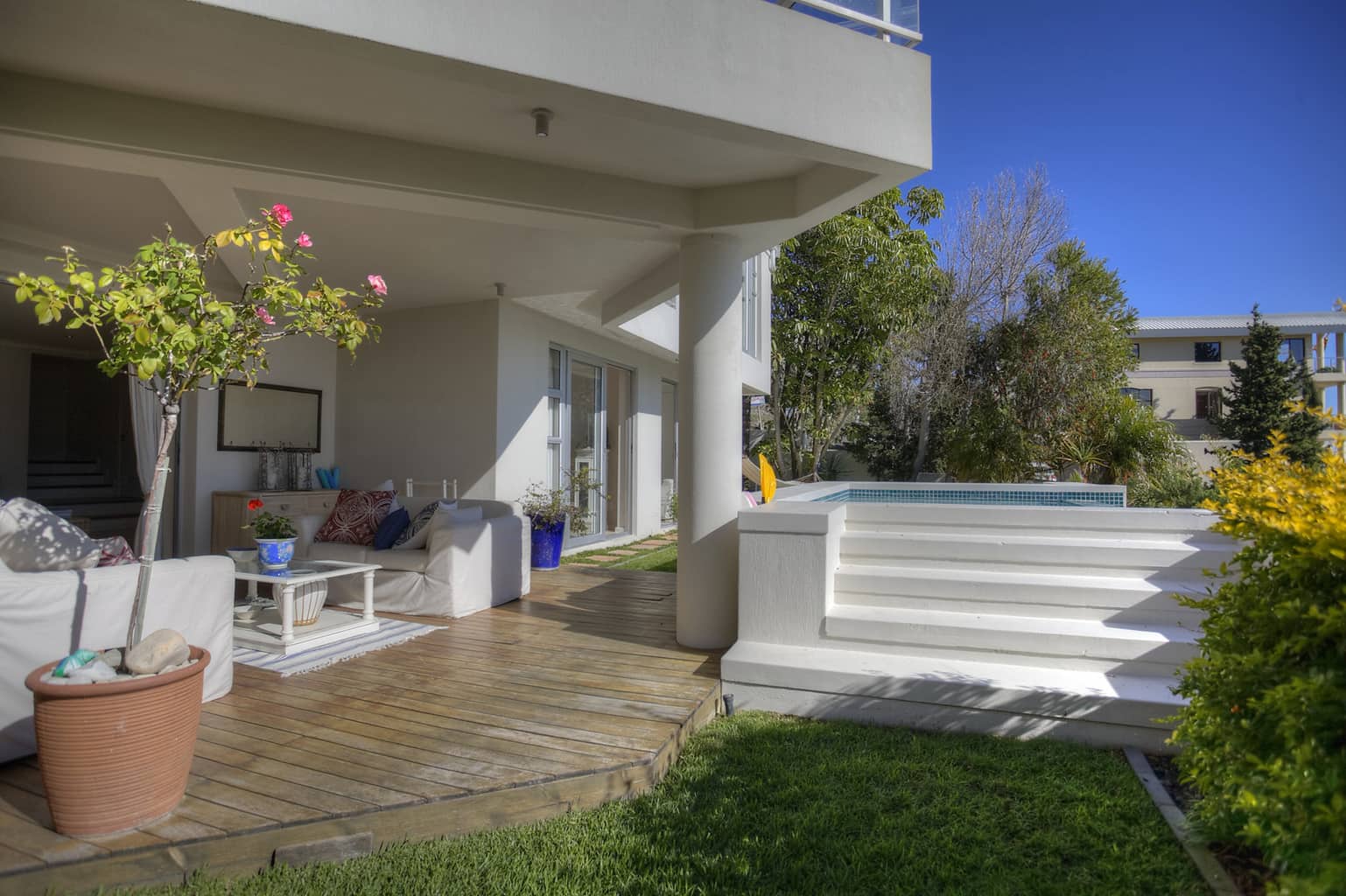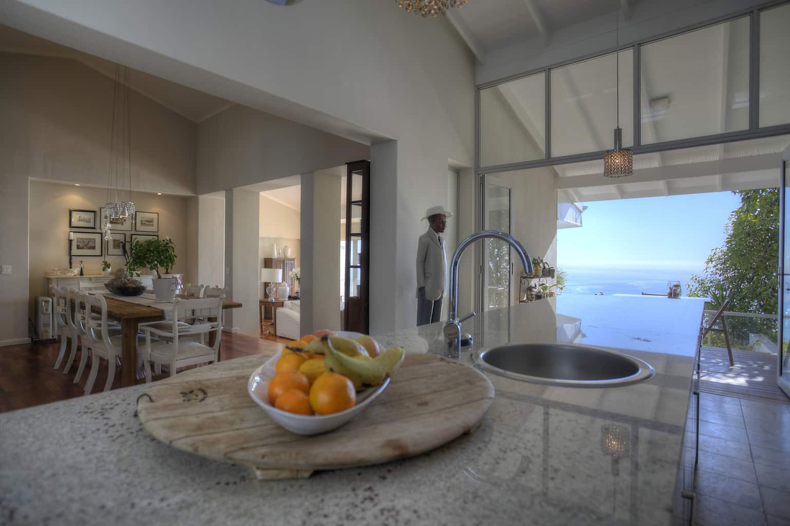 Upstairs the kitchen, dining room with 10 seater table and sitting room open up to the veranda where large groups are easily accommodated for holiday entertaining. The views are truly spectacular. Set in wind-free Bantry Bay, the house is big enough for large scale entertaining, but small enough for a family. The upstairs veranda is perfect for sundowners as well as stylish umbrella covered lunches/dinners whilst a small corner sofa is perfect for that lazy afternoon nap.