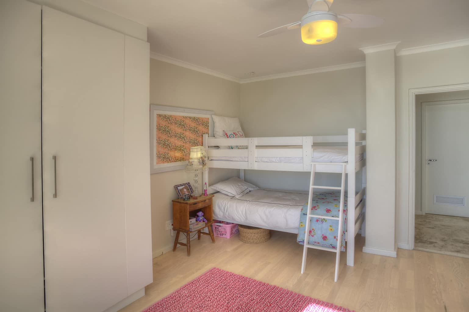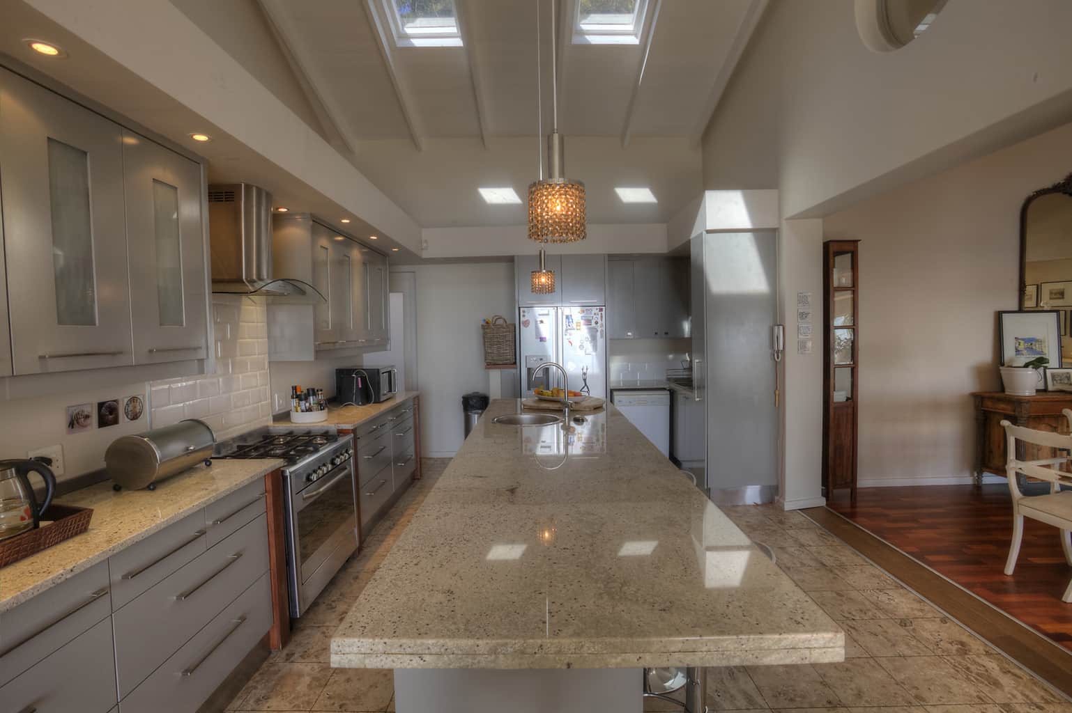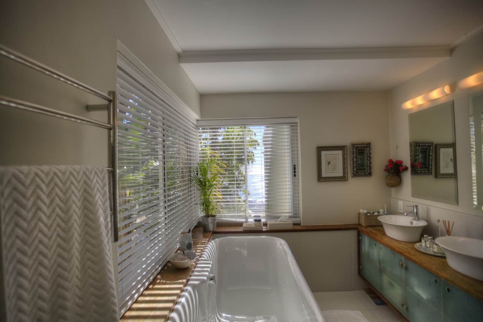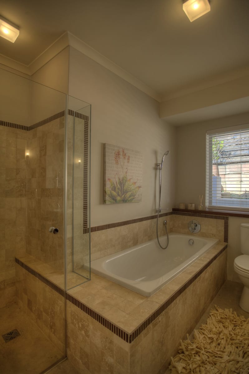 Bedrooms : Upstairs, the Main en-suite has the advantage of a King Size extra length bed and views of the city and ocean all the way to Blouberg. Mornings are glorious in this special place with dawn rising softly over Table Bay harbor whilst sunny afternoons can be lazily whiled away on the chaise lounge. The second bedroom upstairs (also en-suite) has a double canopy bed with doors opening onto a cobblestoned courtyard complete with a small potted herb garden. Downstairs the two bedrooms – one with a double bed, one with a bunk bed – overlook the glorious expanse of ocean and Robben Island. These bedrooms share two bathrooms – one with a bath, the other a shower.