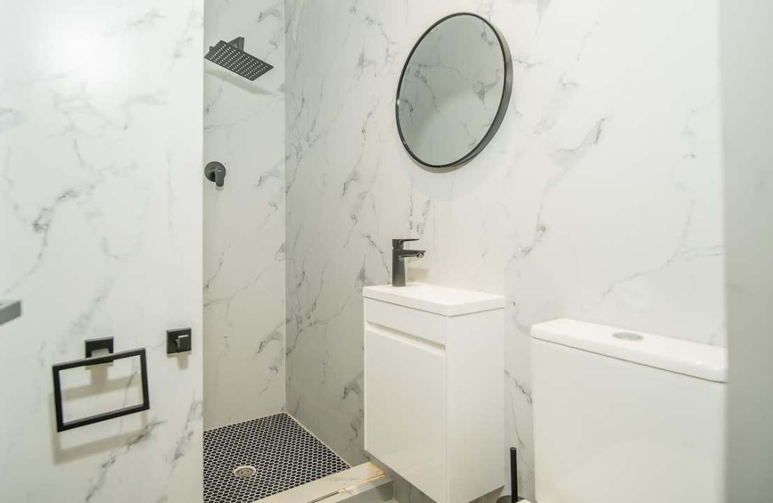 The top-level master suite is a haven of luxury with a queen-size bed, lavish en-suite bathroom, private balcony, and an exclusive wood-fired hot tub. A second bedroom on the same level offers partial sea views, a chic en-suite bathroom, and ample storage. On the entrance level, the third bedroom features a stylish en-suite and private courtyard access.