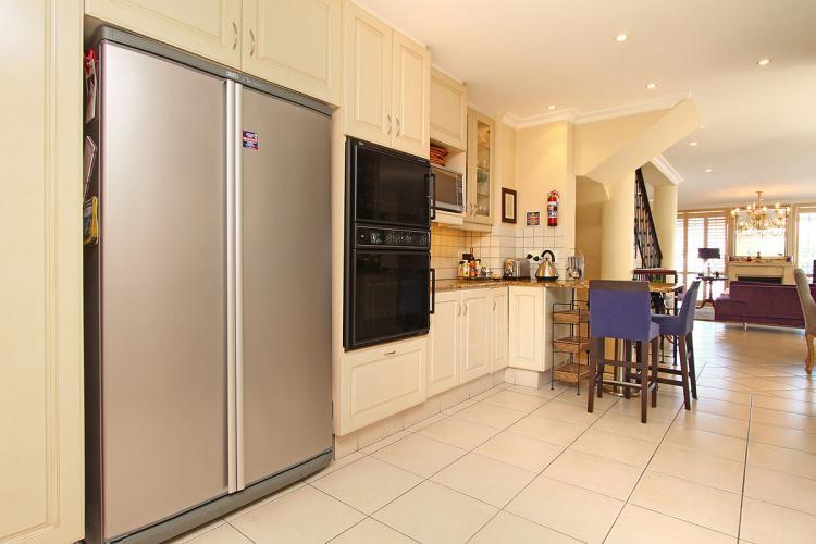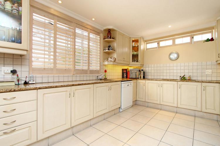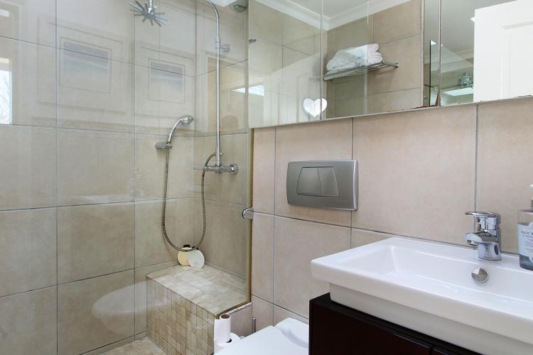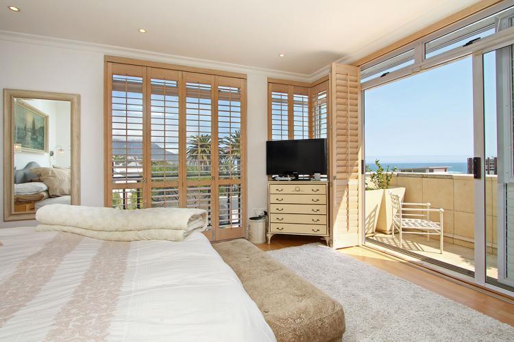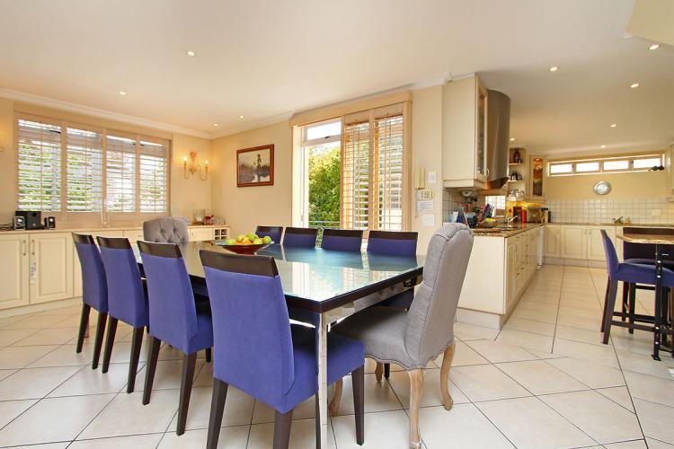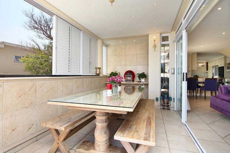 On the 1st floor there is a second more formal living area with sea and mountain views, open plan living area and dining area. The kitchen is spacious and fully equipped. The living area has an enclosed outdoor dining area with large white shutter which can be opened and closed. There is another large TV in this living area with DSTV connection.