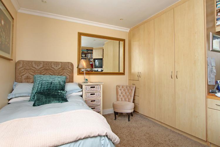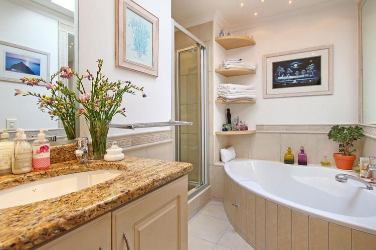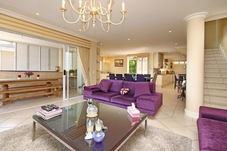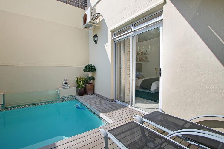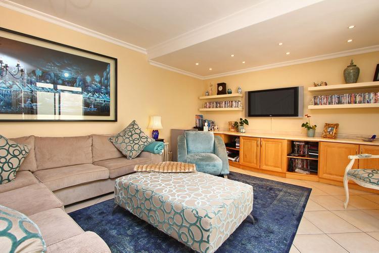 This spectacular 4 bedroom villa is situated metres from the beach on Argyle road in Camps Bay. The villa is situated on 3 floors. The bottom floor is dedicated to relaxing living with soft velvet lounge suite and large LED TV with DSTV. There is a splash pool to the left of this living area and a bedroom with ensuite bathroom which overlooks the pool.