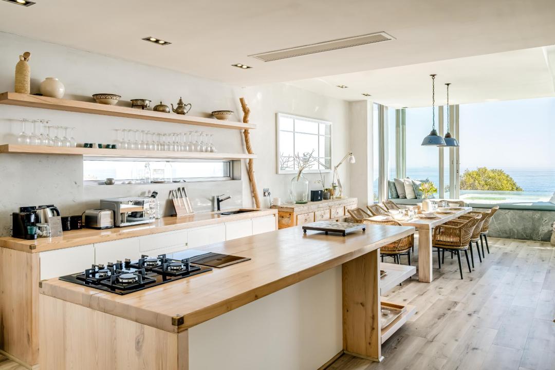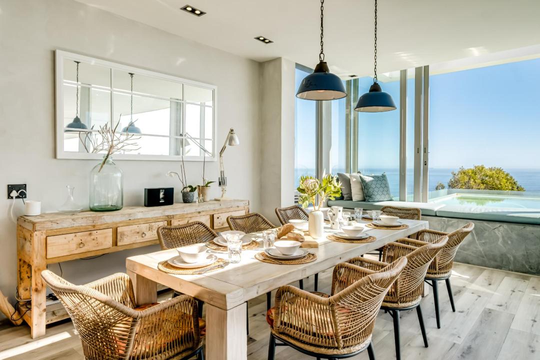 The villa is arranged over two levels and features generous open-plan living spaces designed for both relaxation and entertaining. Large windows frame the dramatic scenery while the living and dining areas flow seamlessly onto a balcony where guests can enjoy the views and fresh ocean air. The dining area comfortably seats eight, while the lounge offers ample seating and a TV for relaxed evenings indoors.