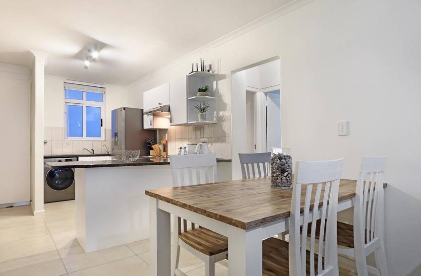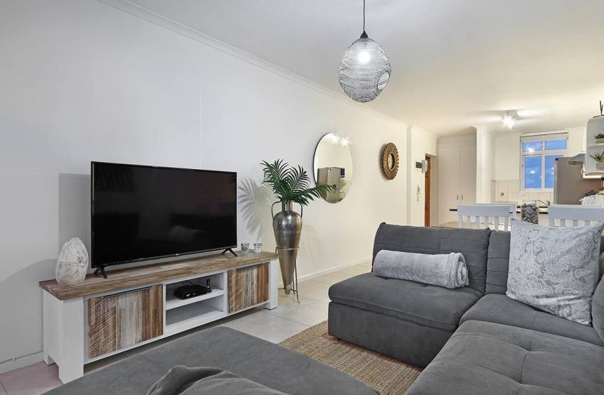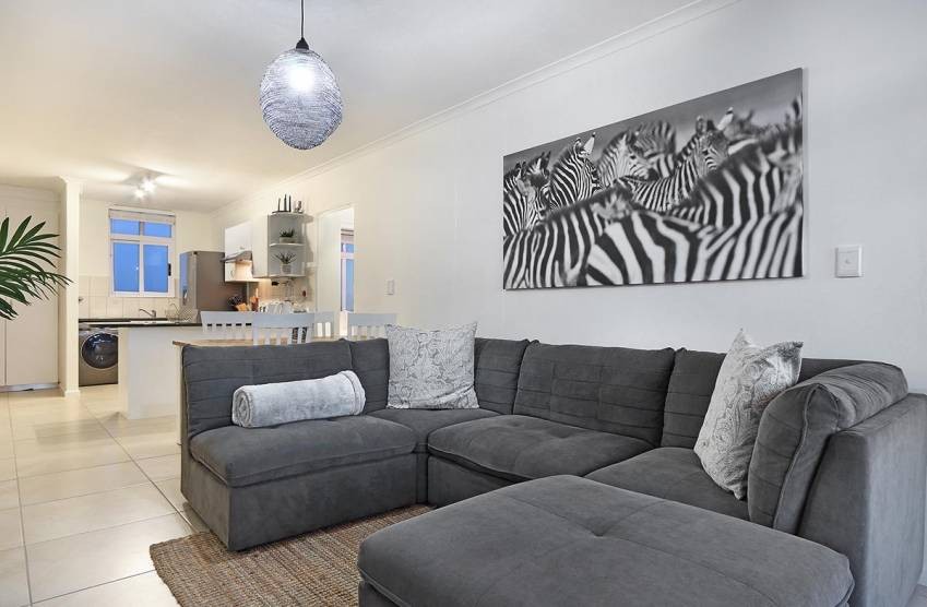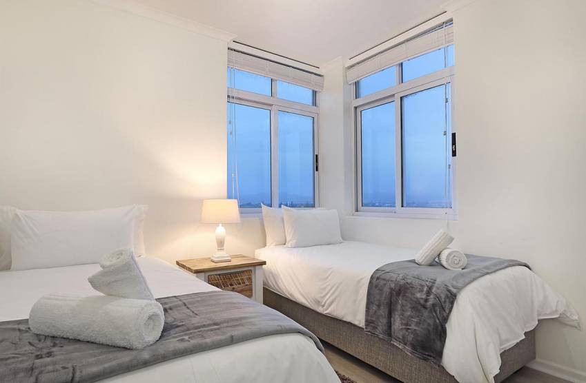 Ideal for a couple, the main bedroom has 2 large sets of windows that look across the ocean; furnished in white, guests will feel relaxed in this luxurious en-suite. The second bedroom, also boasting two sets of large windows, has two comfortable single beds. Guests can unwind in the lounge after a day of discovery in and around Bloubergstrand.