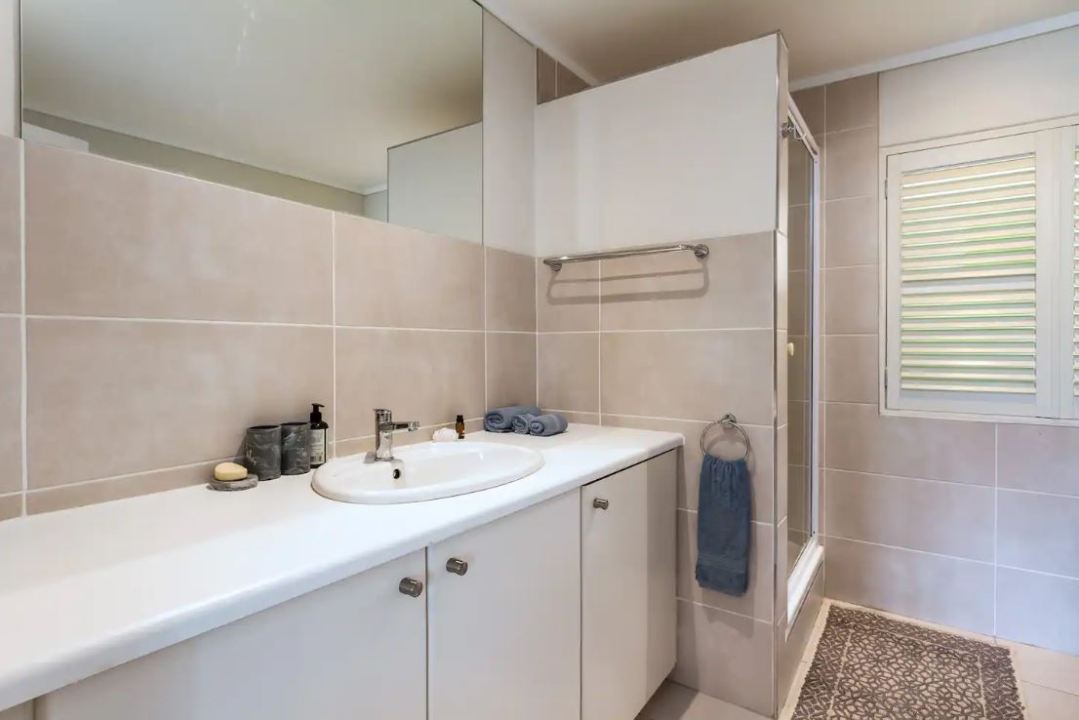 A second bathroom boasts a seamless blend of style and functionality, incorporating a shower.