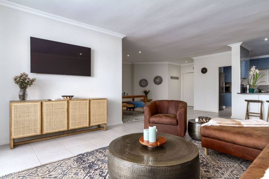 The open-plan lounge is an embodiment of comfort and style, featuring a 4-seater couch and two armchairs. A sleek flatscreen TV is elegantly mounted on the wall, offering both entertainment and visual appeal.