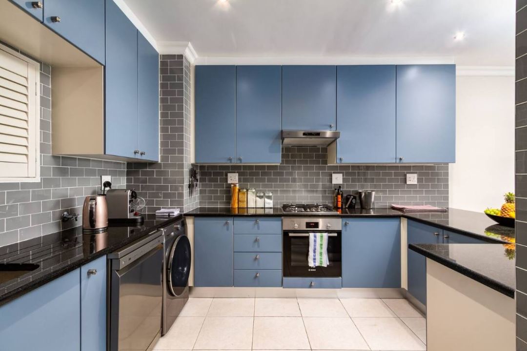 Appliances: microwave, kettle, espresso machine, toaster, dishwasher, washer/dryer. Oven and gas stove.