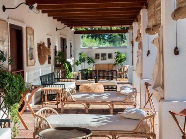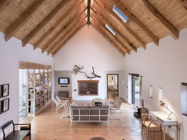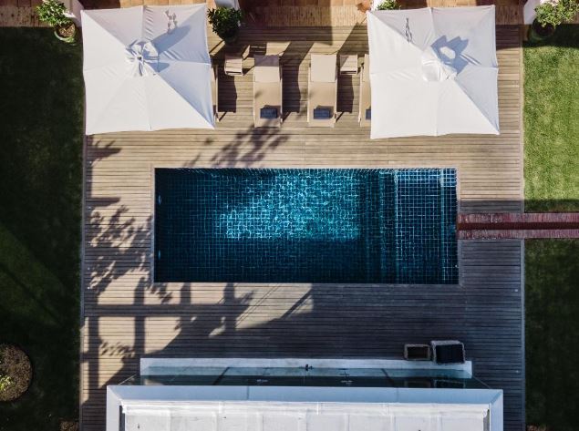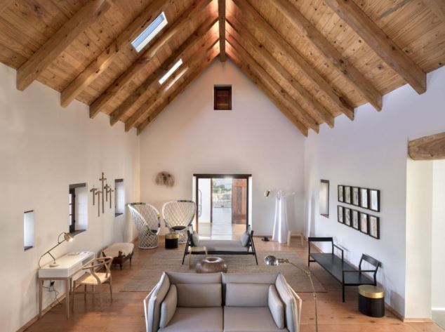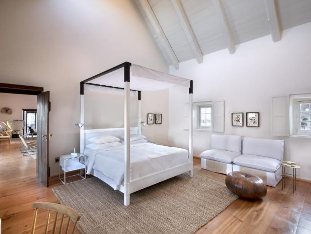 Accommodating up to ten guests, this villa features five individual bedrooms, each equipped with a cozy fireplace and a spacious en-suite bathroom adorned with marble tile floors and luxurious freestanding baths—perfect for unwinding. The expansive lounge opens to a modern glass cube that houses a fully equipped kitchen, seamlessly blending style and functionality. At the heart of the home lies a private central courtyard, designed as a gathering space for friends and family. A crystal-clear pool graces the courtyard, complemented by a shallow channel that mimics the serene streams throughout the property, creating a soothing ambiance with the gentle sound of trickling water.