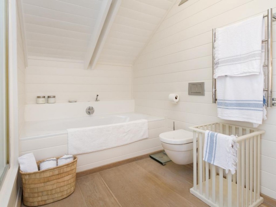 The dining area seats 8 guests and is located in front of a fully equipped kitchen. This leads into a spacious lounge area with a wood-burning fireplace and foldaway doors that open onto a large sun deck. Outside there are sun loungers, comfortable seating and a BBQ.