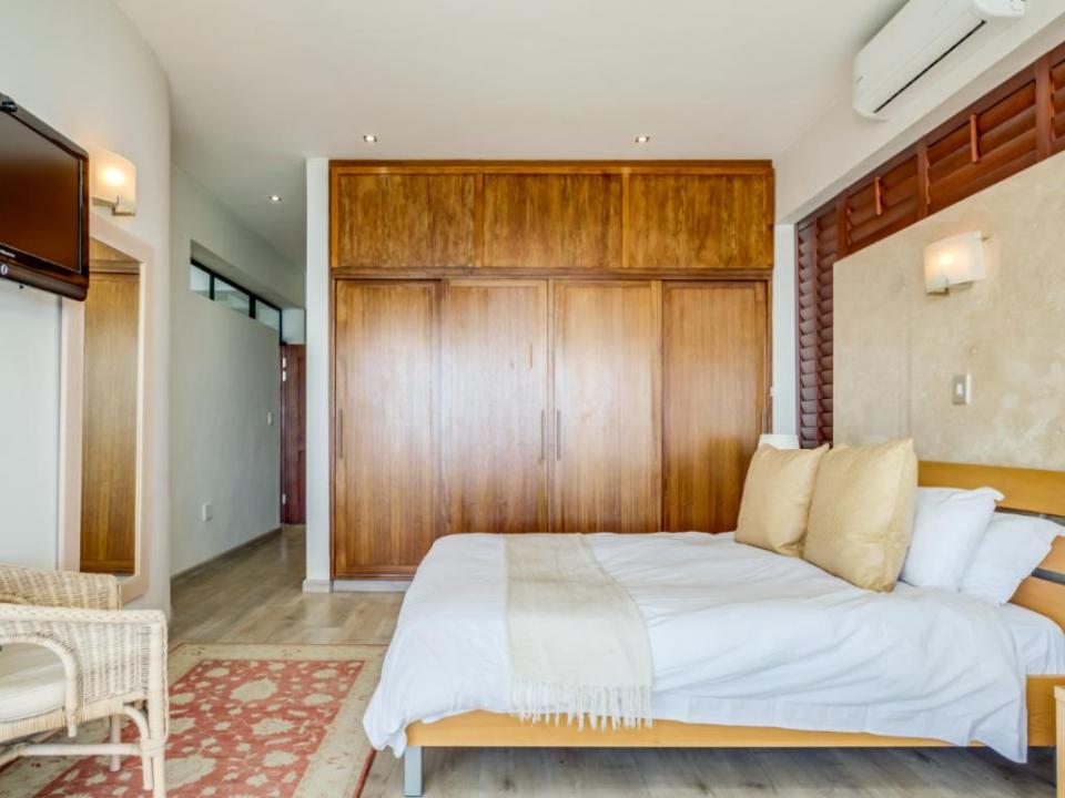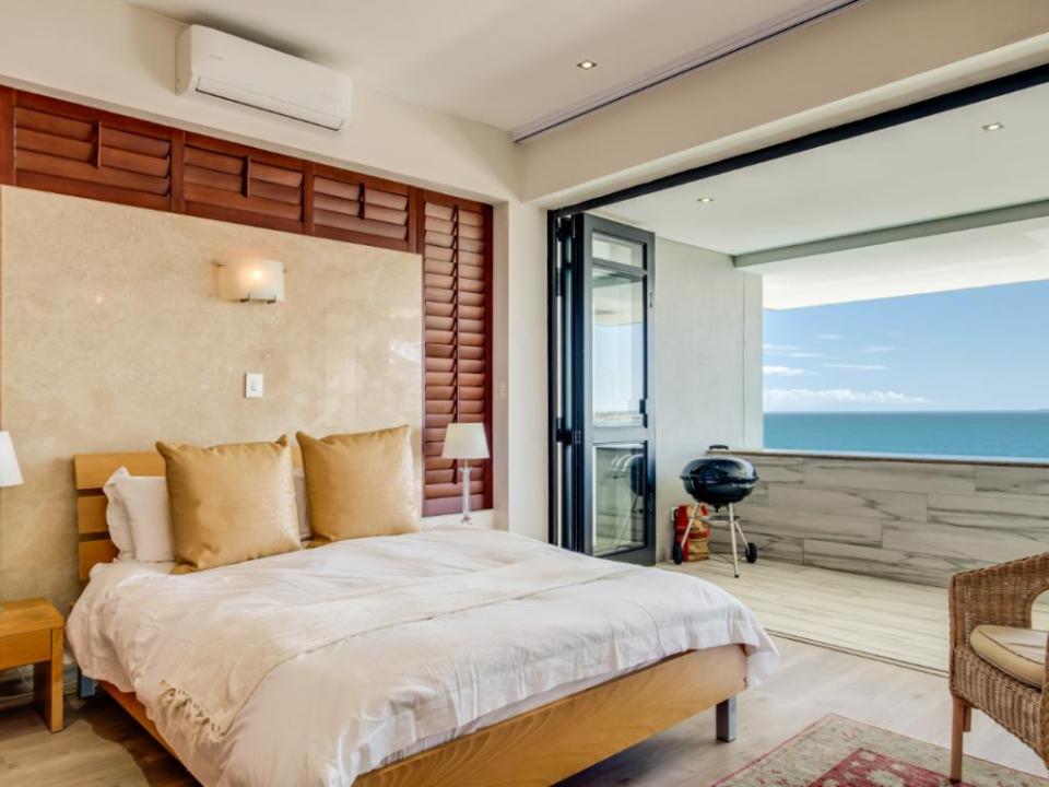 The sea facing master bedroom features a double bed and en-suite bathroom with a bath, shower, bidet, and double vanities, as well as a flat-screen television for added convenience.