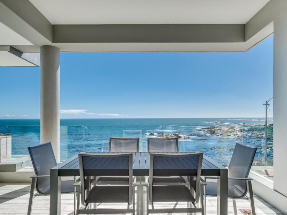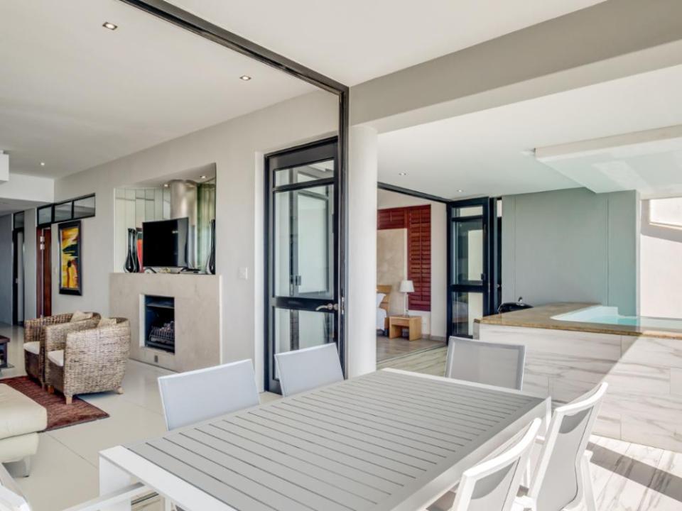 The open plan living and dining area flow through glass doors onto the balcony with amazing views, a private plunge pool, barbeque and outdoor seating for 6 people. TV with DSTV Gas fireplace