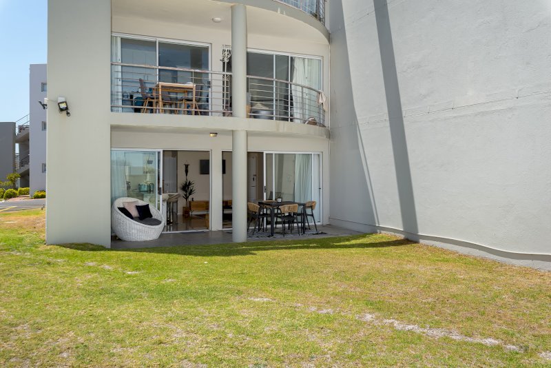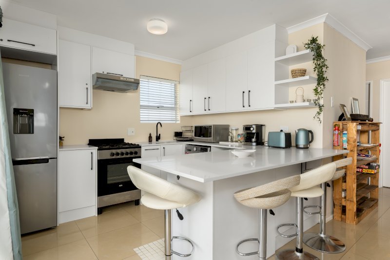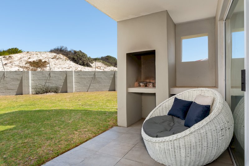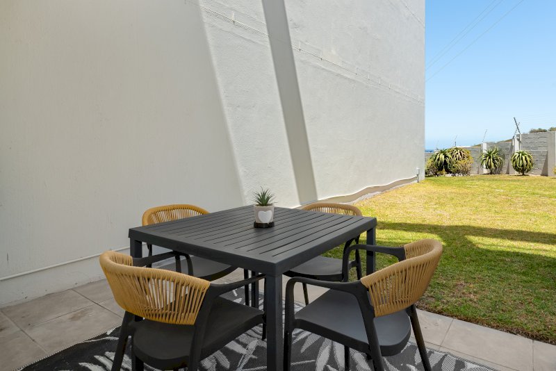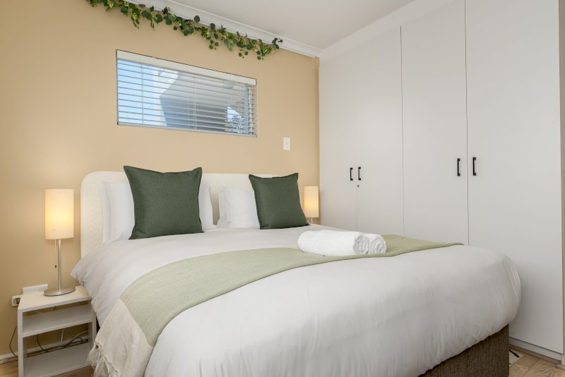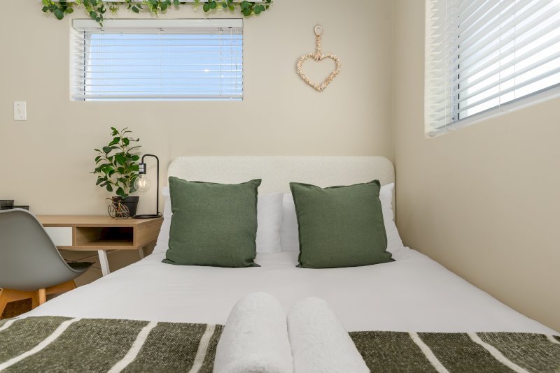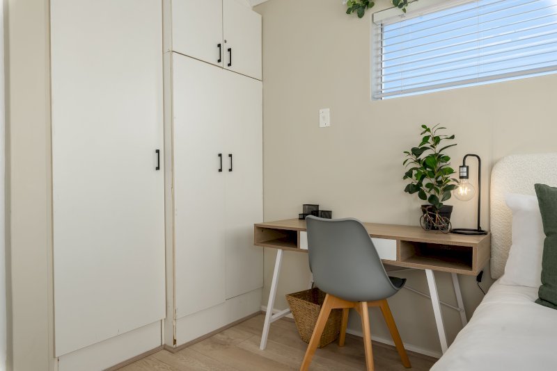 The apartment features an open-plan kitchen and lounge that opens onto a patio with a braai and a shared garden. Both bedrooms are thoughtfully set up for comfort and functionality. The first bedroom has a queen-sized bed, while the second bedroom has a double bed. Each room includes a study desk and ample cupboard storage, making the space ideal for longer stays or remote work.