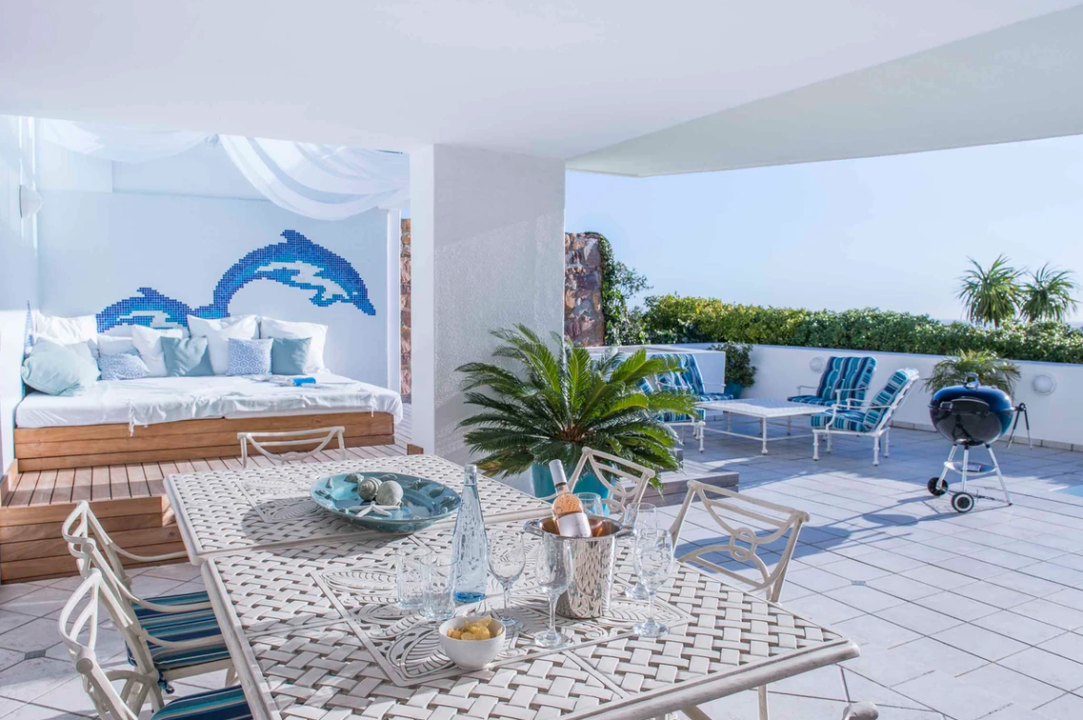 Penthouse spacious living & dining area with a 10-seater dining table, all leading onto a balcony with a large outside seating area with fantastic sea & mountain views