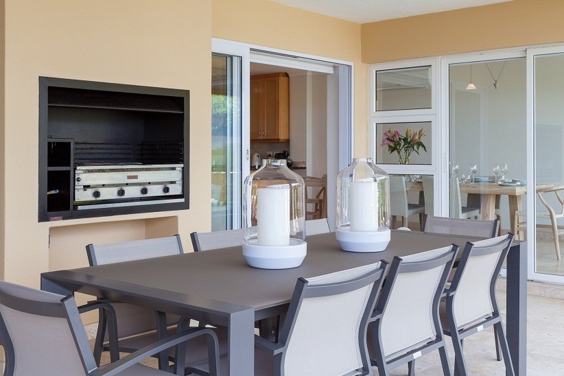 The main bedroom en-suite is on the same level and also leads out to the pool deck. Two double bedrooms are found on the upper level, both opening onto a balcony from which the wonderful sea views can be enjoyed.