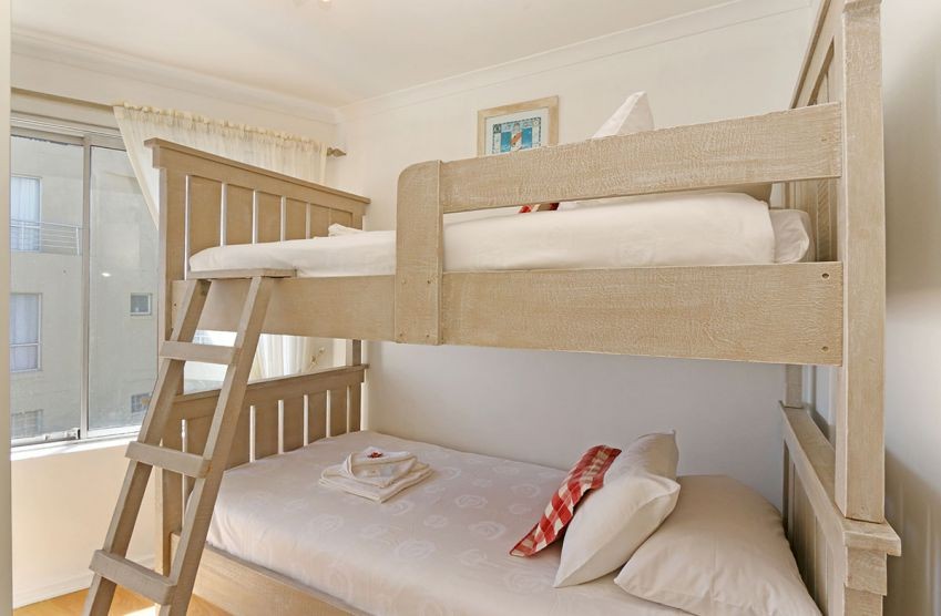 The main bedroom, with access to a balcony and ocean views, consists of a queen-size bed while the second has 2 bunk beds.