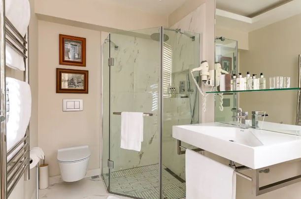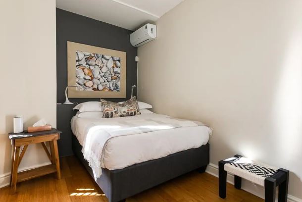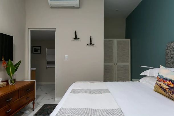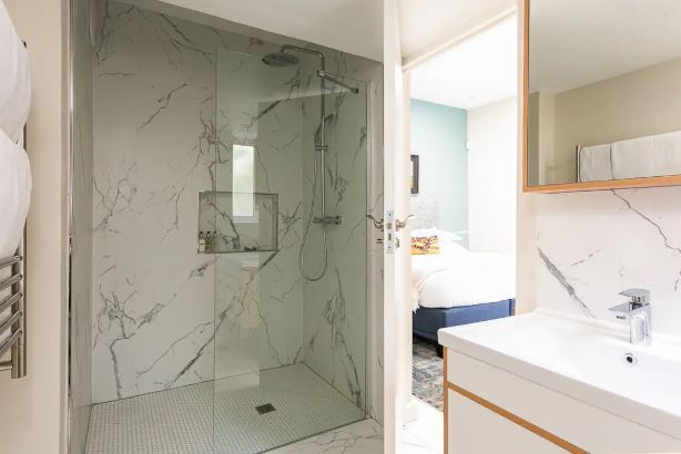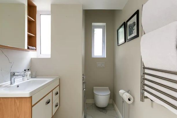 Queen size bed and marble bathroom with shower, wall mounted hair dryer, heated towel rail and underfloor heating, just across the passage (also the guest bathroom). Air-con and smart TV with satellite channels and Netflix.