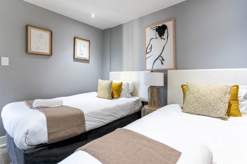 The master bedroom offers a peaceful retreat with an en-suite bathroom, while the second bedroom is ideal for friends or family, featuring twin beds and access to a separate bathroom. Residents also enjoy access to a communal pool and recreation area within the building.