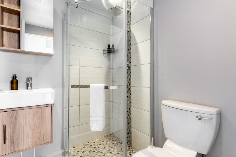 Separate bathroom with free-standing shower