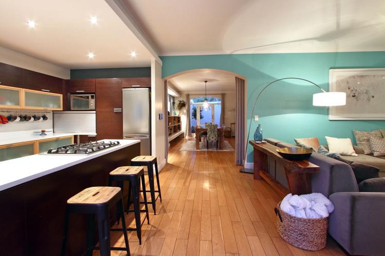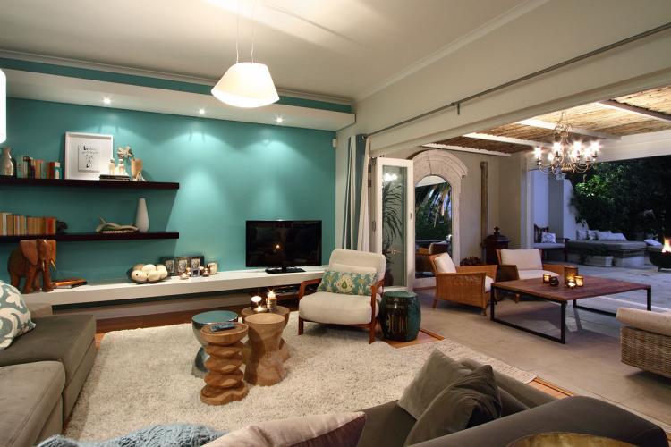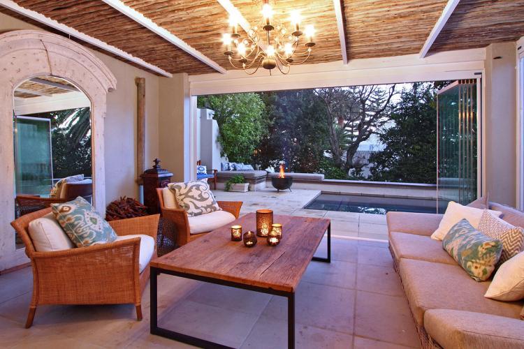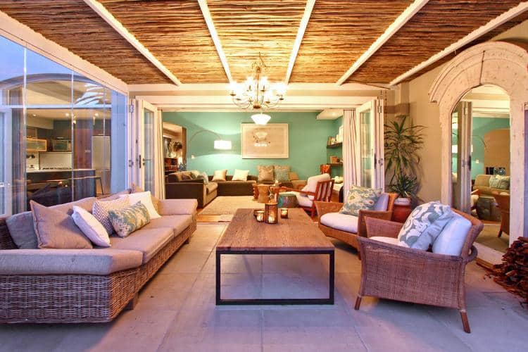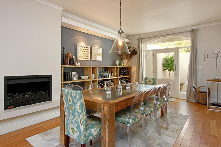 The modern kitchen is open plan and overlooks the living room. It is complete with gas stove top, convection ovens and opaque glass cupboards. The living room is beautifully furnished in shades of cool greens set against chrome features and natural earth toned accessories. Concertina wooden doors open up into a conservatory, which overlooks the pool area. Wicker furniture, a large white washed feature mirror and old furnace make this a wonderful retreat any time of year. Leading off the kitchen and living room is the dining area with large, ten seater wooden dining table. Custom shelving and unique wall art frame this space perfectly. For cooler evenings this room can be heated by gas fireplace.