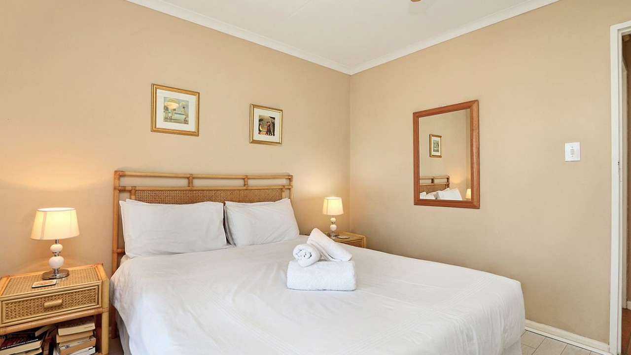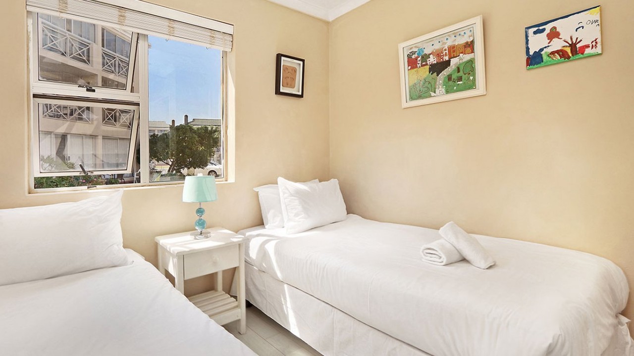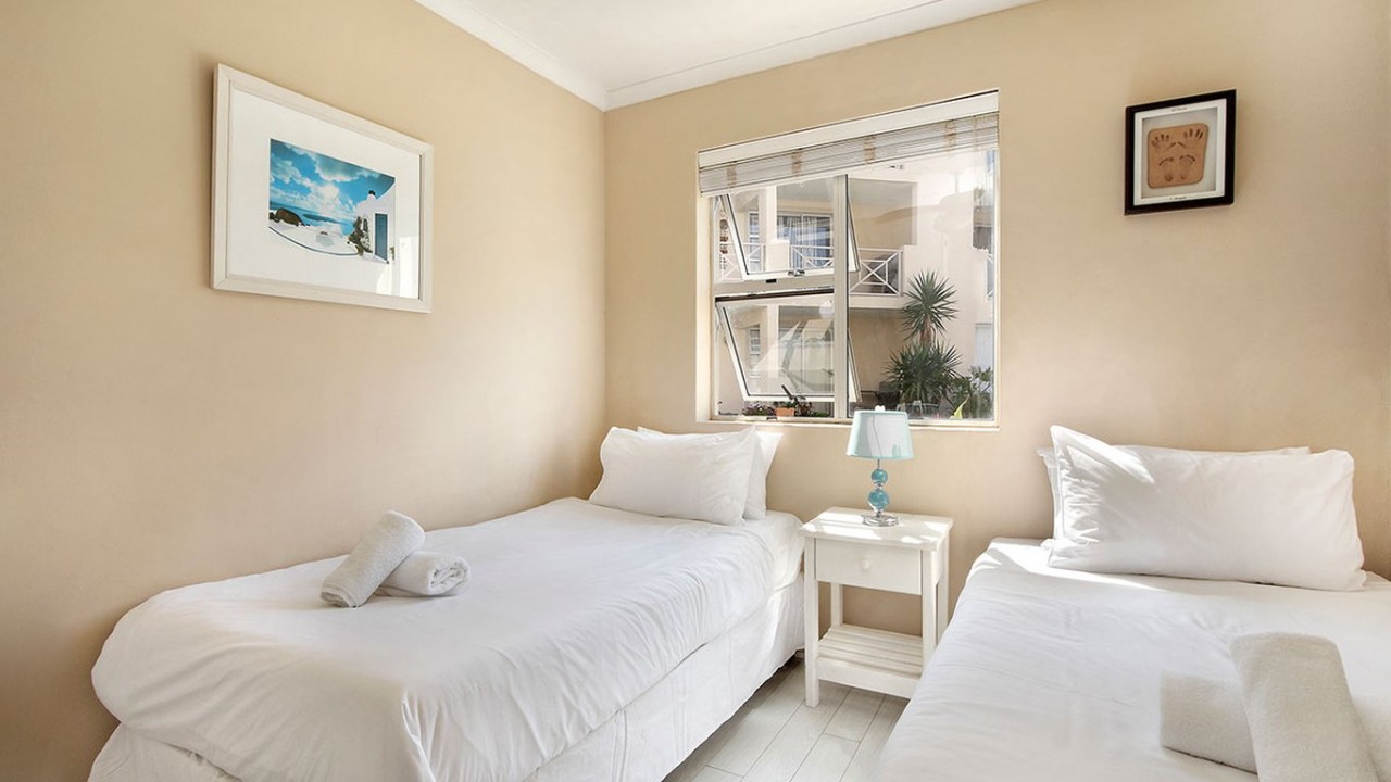 This beautiful 2 bedroom apartment is equipped with everything you need for a self catering holiday in Cape Town. The main bedroom comprises of a Queen size bed and is fitted with a ceiling fan for those hot summer evenings. The second bedroom comprises of 2 x single beds and features a big window that floods the room with sunlight. The bathroom is fitted with a shower, bath and toilet.
