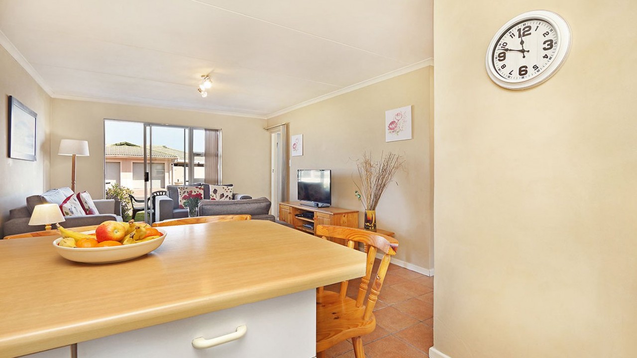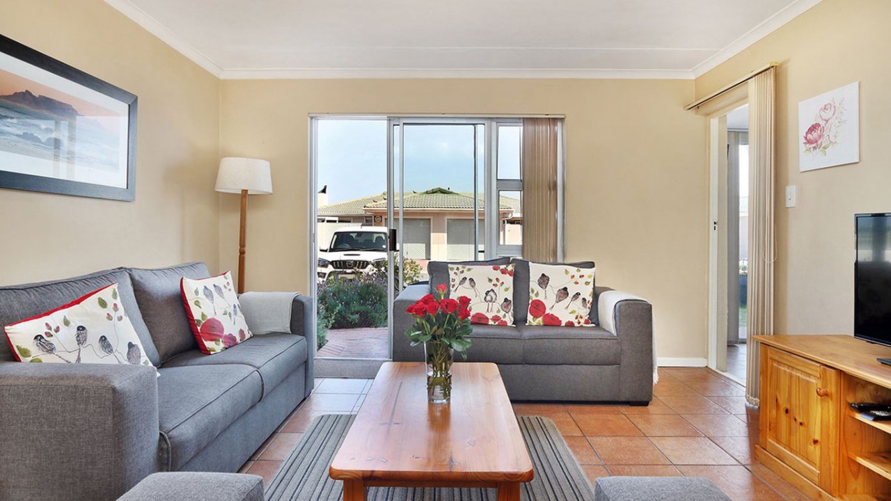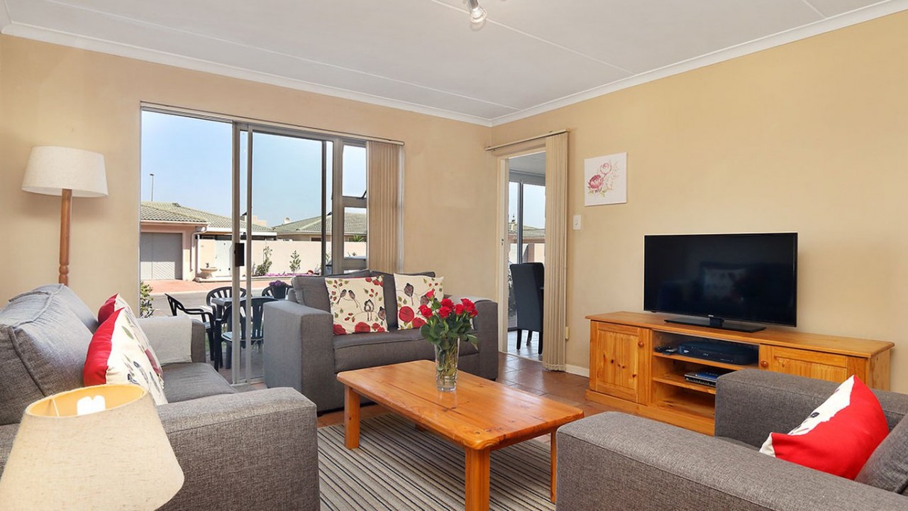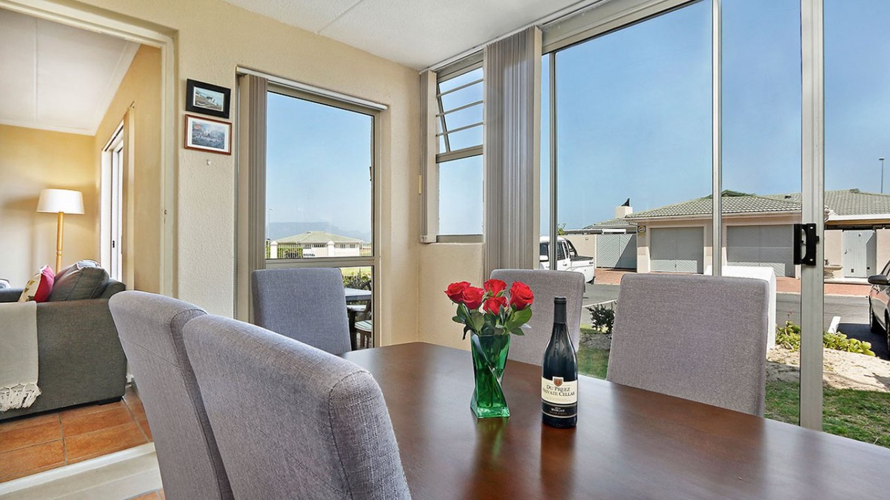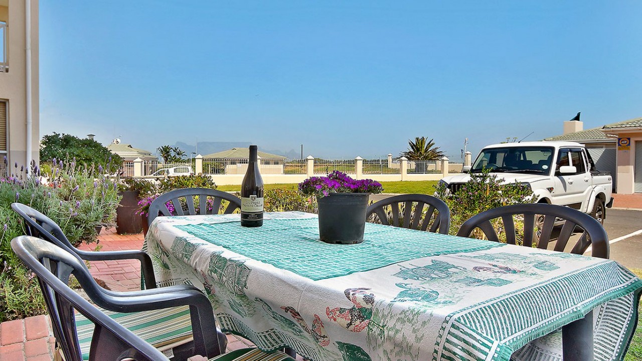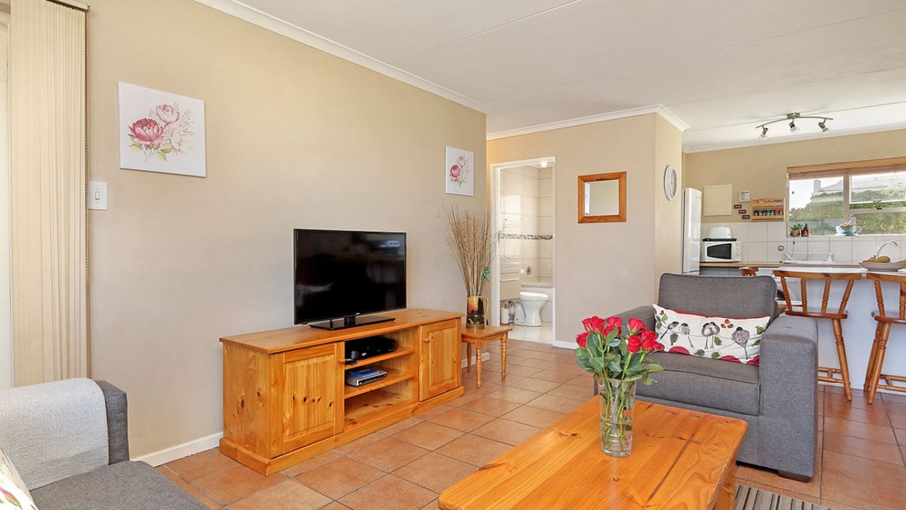 The lounge is comfortably furnished and features a flat screen TV, DSTV and sliding doors that open to the patio area. The kitchen is fully equipped with a oven, stove and washing machine. This apartment also features an inside dining area with a view of Table Mountain and sliding doors that open up onto an outside patio area. With outside seating featuring a BBQ , beautiful views of Table Mountain and a lovely garden, this is the perfect holiday location.