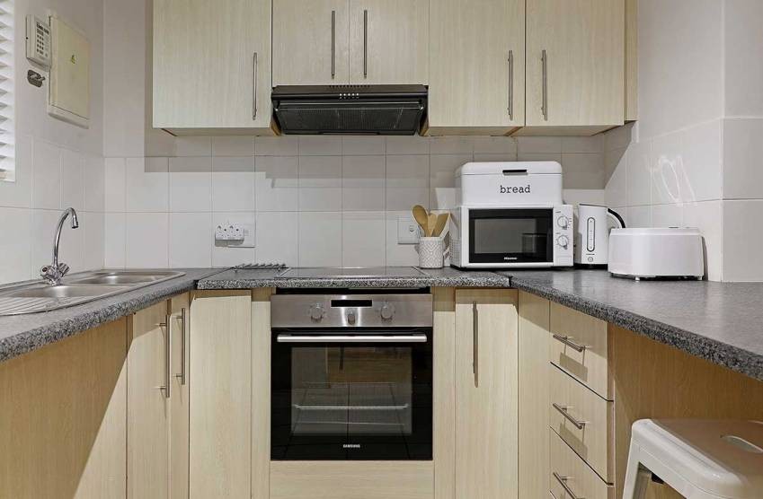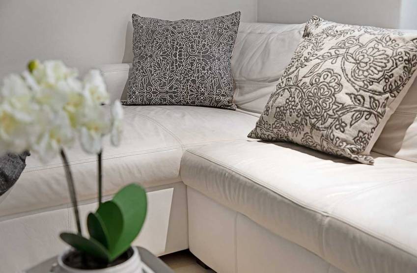 The apartment has a fully equipped kitchen and an open plan living area that is furnished with a large L-shaped couch that faces the flat screen TV as well as sliding doors that open onto the balcony.