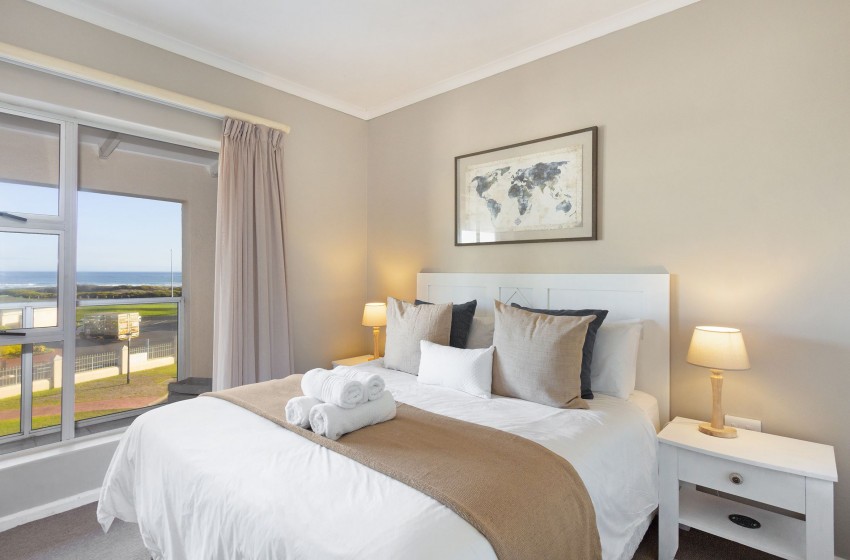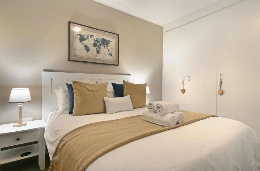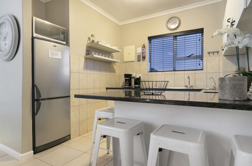 This apartment blurs the lines between class and comfort, with a cool-white aesthetic to create an ambience not easily replicated. The kitchen area provides guests with a dark granite counter, ample cupboard space, and all appliances required to deliver a world-class self-catering solution. The lounge creates an intimate hub with a flat-screen tv with access to uncapped fibre and a view for you and your loved ones to take in the spectacular views without sacrificing comfort. You can make the most of the indoor space, by moving the table on display in the living room away from the wall, creating a comfortable dining setting. The kitchen provides a suitable dining setting, while the patio area makes for a great way to watch the sunset while enjoying a glass of wine.