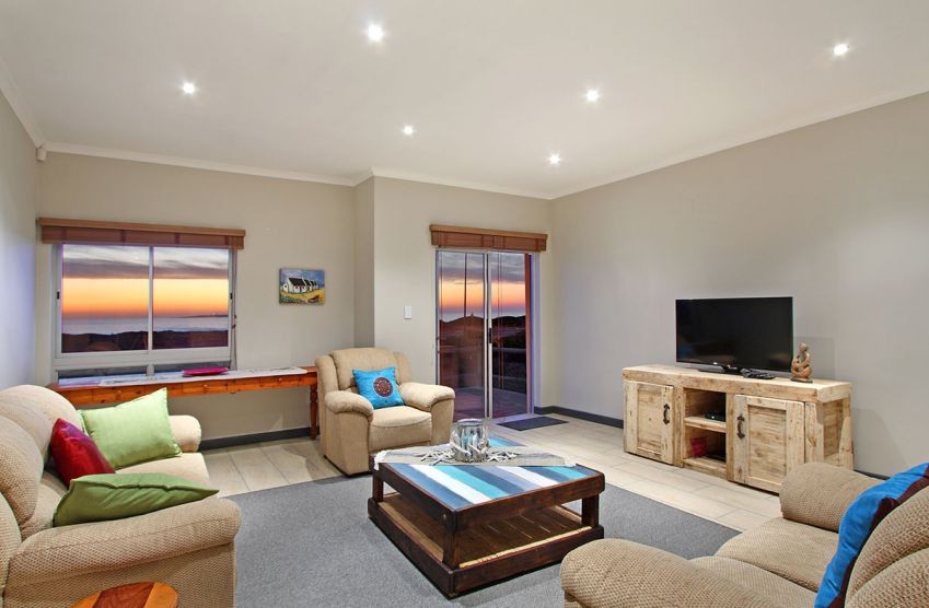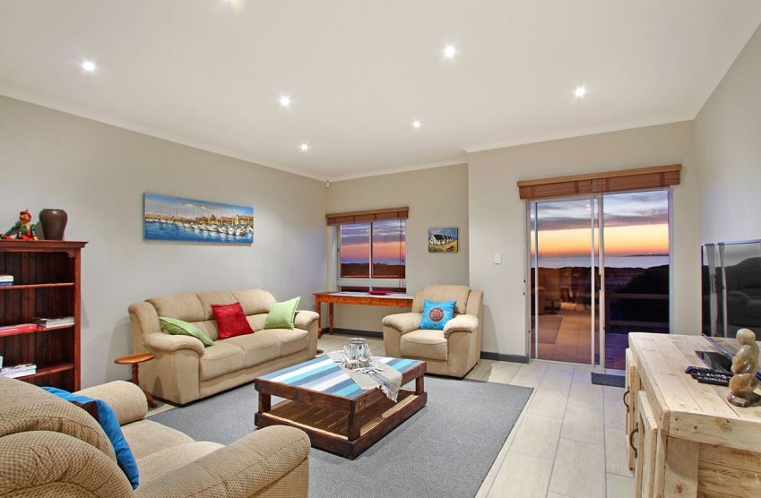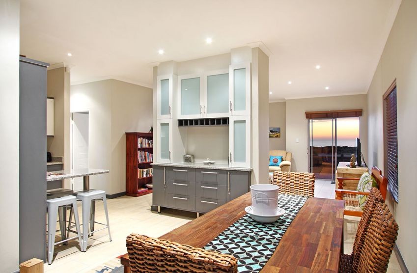 From the living area an extensive patio area can be accessed with artistic stone table and benches that seat 8 for some easy outdoor dining with the backdrop being a superb view of the Atlantic Ocean and the far-off Table Mountain, above the glittering lights of the Cape Town city bowl.