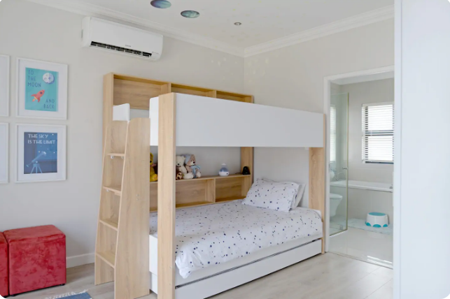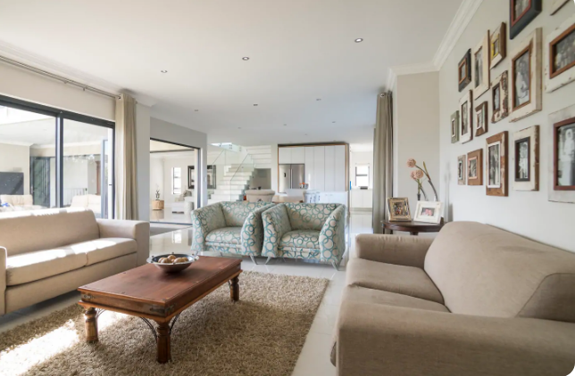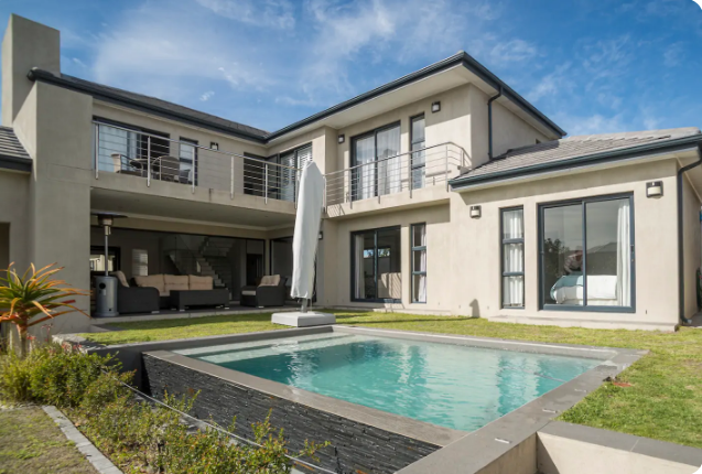 Downstairs you will have the open plan living area with two massive lounges on both sides of the kitchen with each a TV, a dining area for 8 people and a kitchen/ breakfast table for four. The kitchen itself is equipped with a gas stove, a nespresso machine, microwave, dishwasher, a separate wash kitchen with a washing machine and tumble dryer. Literally everything you need and more in top notch quality. In the Garden you have a patio lounge area with a build in typical South African Braai as well as your private pool and a trampoline.