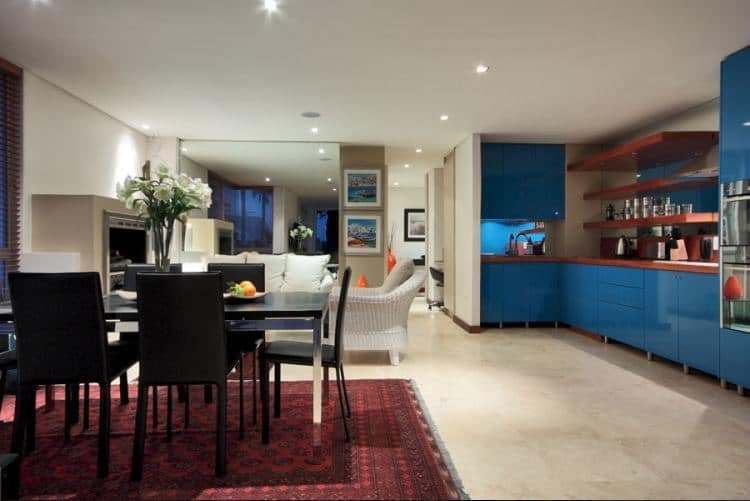 The large open plan living room currently features two separate lounge areas, a dining room and open plan designer kitchen. There is also an indoor fireplace for the colder evenings.