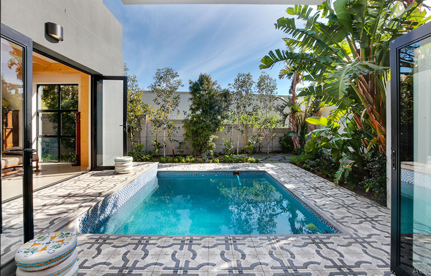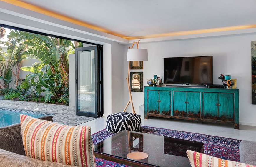 Beautifully appointed furniture with stacking doors opening onto pool area.