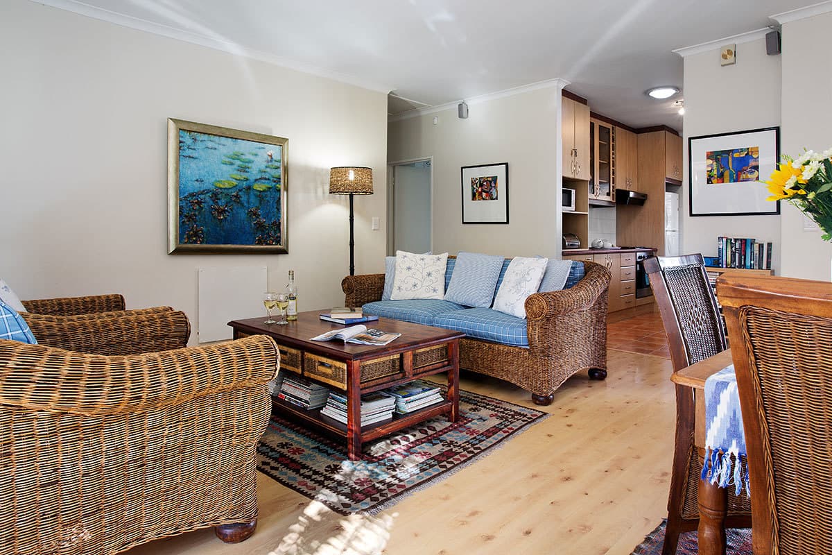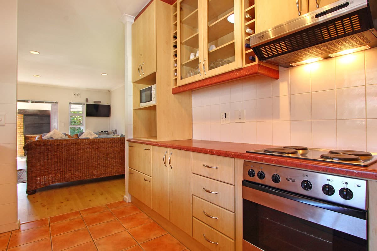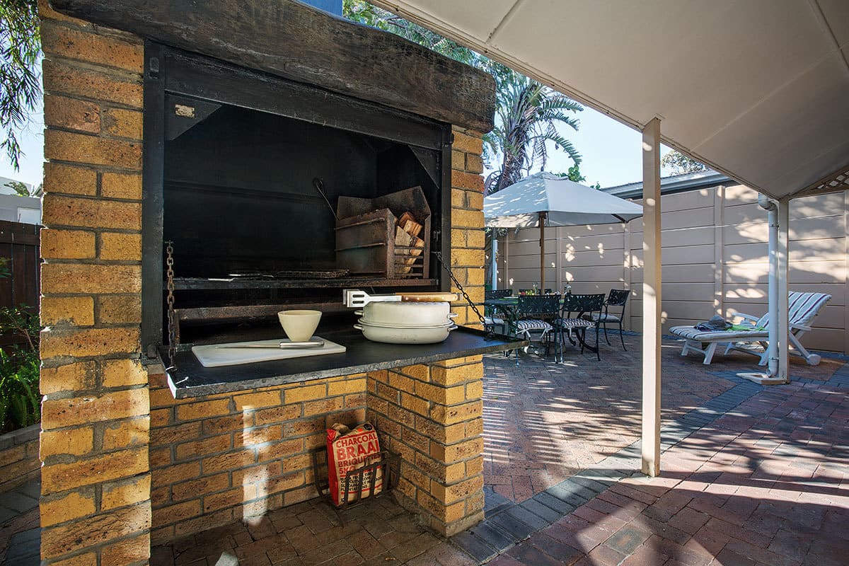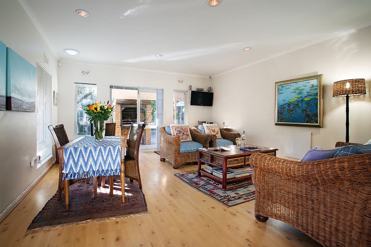 Bliss Cottage guarantees an enjoyable and hassle-free self-catering experience. An open-plan interior connects the lounge, dining room and kitchen. The dining area and lounge – with satellite TV – opens onto a private and enclosed outdoor patio with excellent built-in barbeque facilities. The kitchen is fully equipped with cutlery, crockery, cooking utensils, fridge/freezer, microwave, dishwasher and cooking basics like salt and pepper as well as some herbs and spices. A lock-up single garage houses the washing machine & dryer.