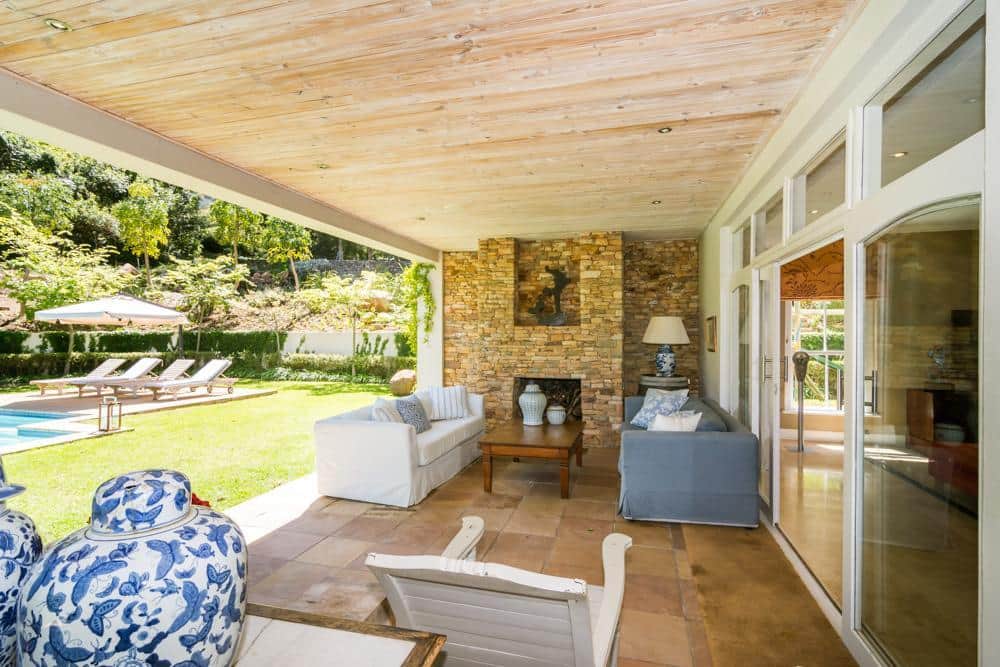 Covered verandah with fireplace, couches, table and chairs