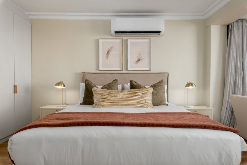 - King bedroom + large private balcony with sweeping ocean views + ensuite bathroom (walk-in shower) + double vanity + air con