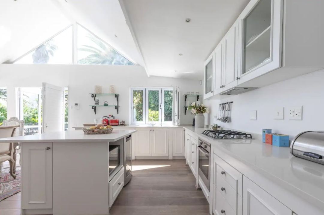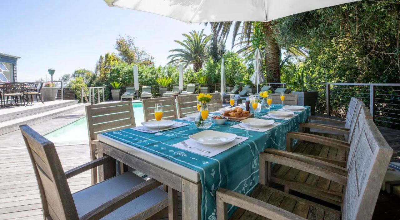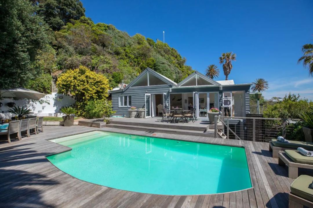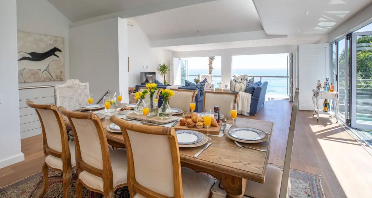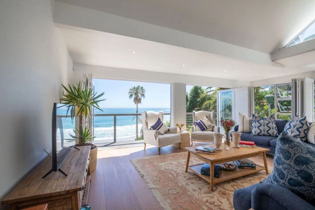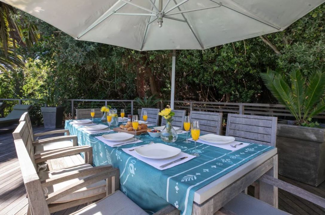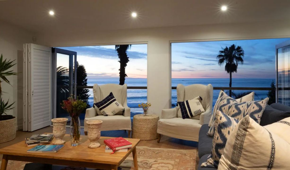 The upper level of the property is completely open plan with a huge kitchen and separate scullery, allowing for laid-back dining and entertaining. The al fresco living and outdoor area have seamless flow, with plenty of outdoor entertaining spaces. A large outdoor seated dining area, 8 sun loungers, and a huge pool complete this picture-perfect property. The upper level also consists of the main bedroom, and en-suite with expansive views over Clifton 3rd beach.
