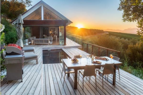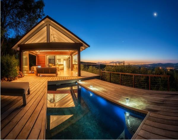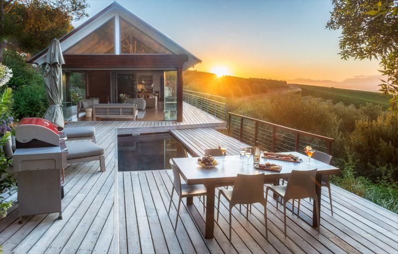 The main lodge is separated from the two bedroom cottage by a landscaped deck and pool area overlooking the spectacular west-facing views over the vineyards, valley and Table Mountain. The separate cottage comprises of two en-suite bedrooms. One of these bedrooms consists of an extra length king size bed and the other consists of twin beds.
