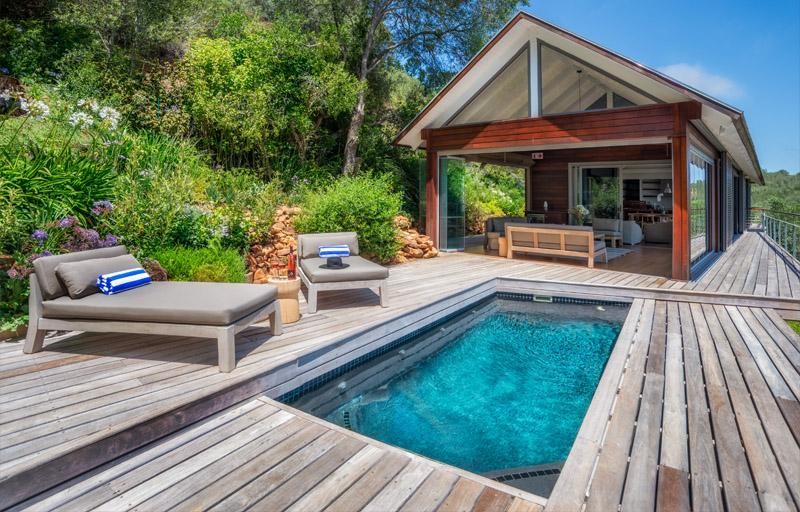 Large glass sliding doors open up from the sun lounge onto the stunning pool and deck area. Guests can take time out to relax on the sun loungers and a gas braai/BBQ is at their disposal for outdoor cooking.