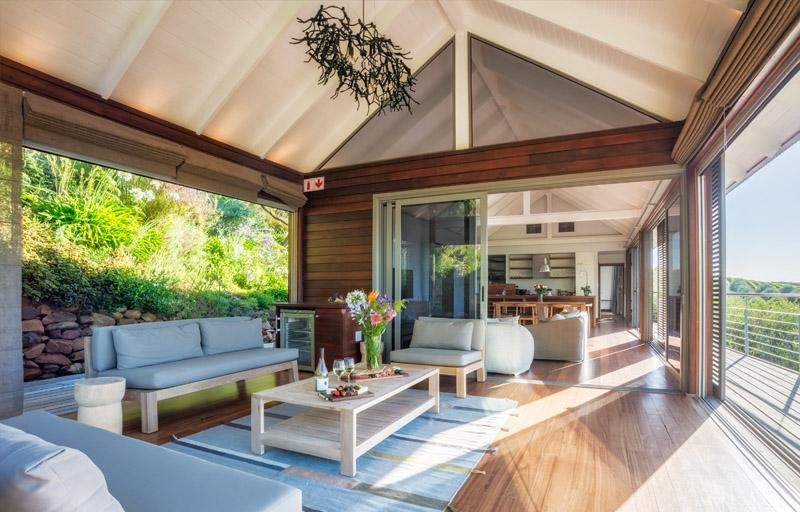 The exterior is clad in weather-resistant Jarrah timber with matching sliding screens that shield the west-facing doors and windows against the late afternoon sun.