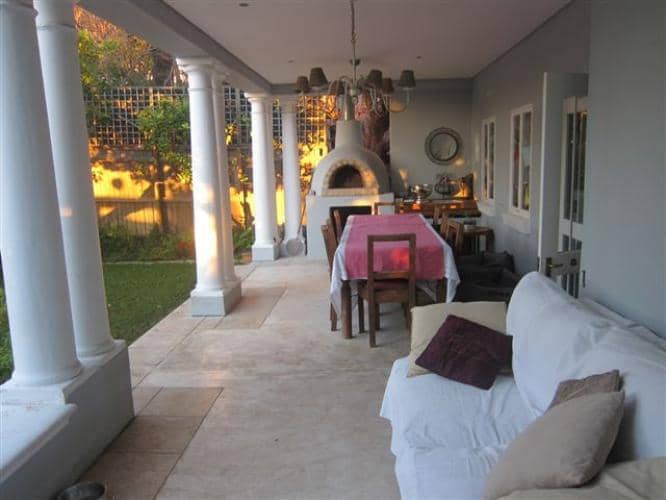 The kitchen leads onto the TV lounge and both open onto a large outside patio with a dining room table and pizza oven. The patio overlooks the garden and swimming pool.