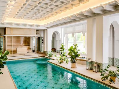 One of the villa’s standout features is the expansive indoor spa area. Here, guests can unwind in the heated indoor swimming pool, rejuvenate in the sauna or ice bath, and enjoy a relaxing atmosphere beside the fireplace. Massage tables and lounge seating further enhance the spa experience, creating a private wellness sanctuary within the home.