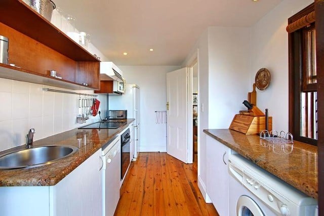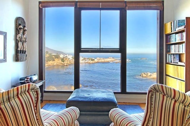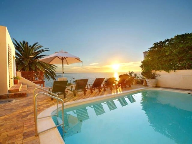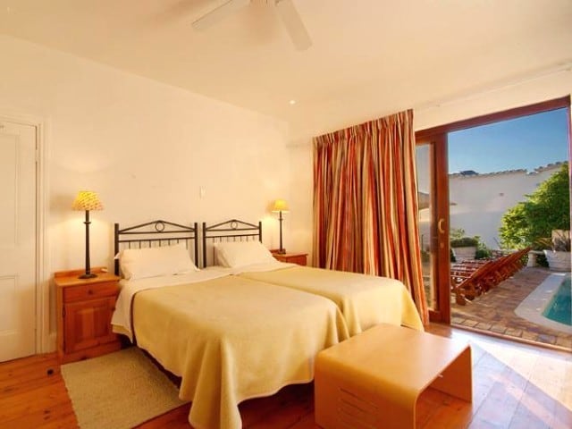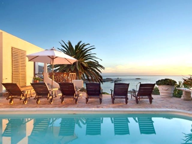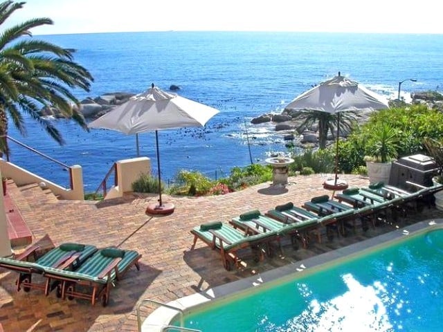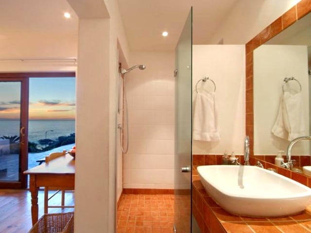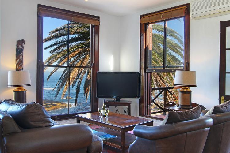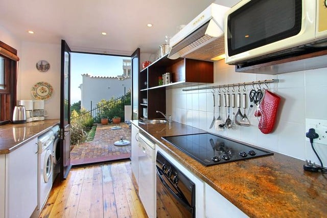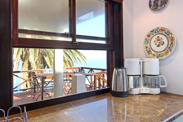 The two comfortable wing chairs are the ideal spot for watching the endless change of the ocean, and the large leather sofa invites you to curl up in front of the satellite TV or to enjoy a good book. Old-fashioned double doors open onto a terrace with table and chairs to enjoy al fresco dining. A few steps lead to the paved sun terrace and a large solar heated swimming pool and barbeque. The six sun loungers are the perfect spot to watch the sun set into the Atlantic with a chilled glass of wine in your hand. The three bedrooms of this self catering accommodation in Cape Town are all accessed from the living area and have views of mountain and sea, each with its own en-suite bathroom. Two rooms have queen-sized beds, and one is a twin that can be made up as a king-size bed. One bathroom has a bath and a separate shower, the other two have showers only. The kitchen is very well equipped with everything required for simple catering. A UPS ensures that there are lights and uninterrupted TV viewing during load shedding.