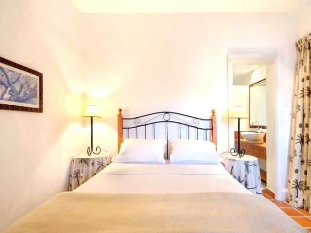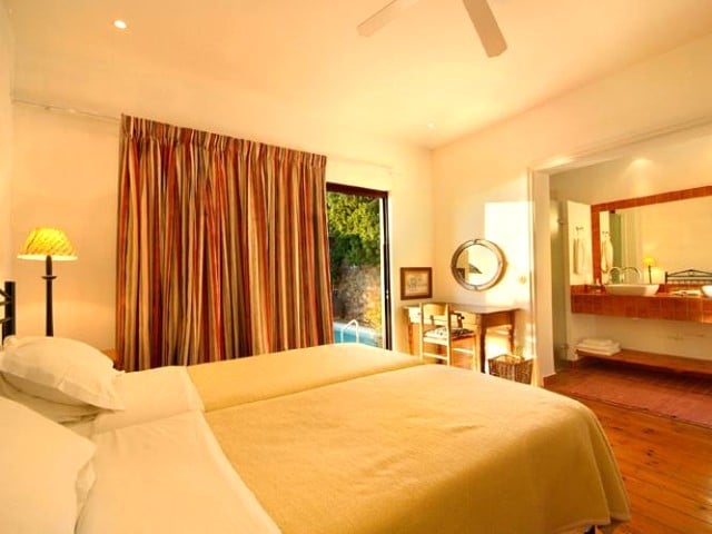 This bedroom has access onto the pool terrace King size bed which can be split into twins on request Open plan en-suite bathroom with shower Ceiling fan