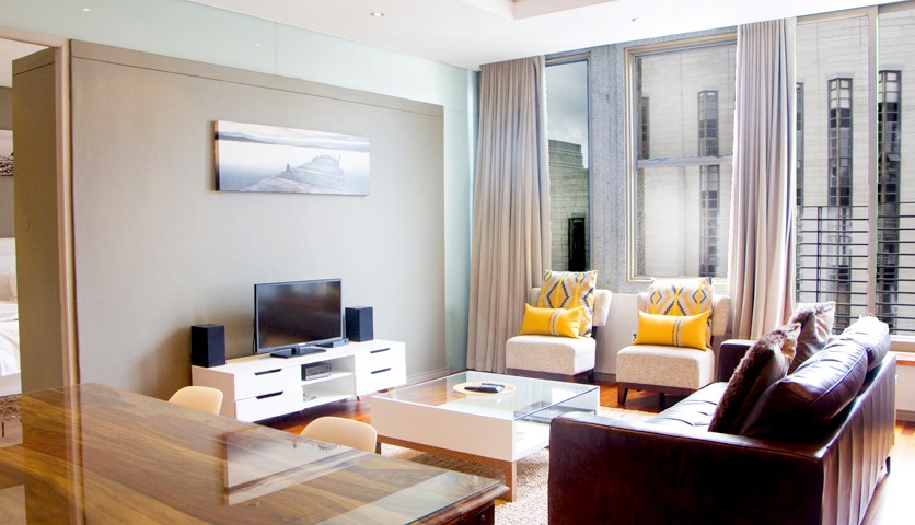 The contemporary furniture and furnishing were hand-selected for corporate clients’ relaxing stay in this sun-drenched 1-bedroom, 1-bathroom apartment.
